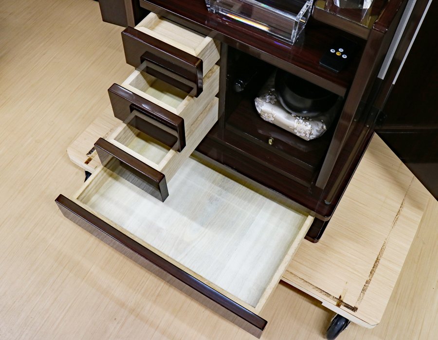 厨子扉には押し込み式大戸ですので、押し込むことで斜めからもご本尊様を拝すことができます。