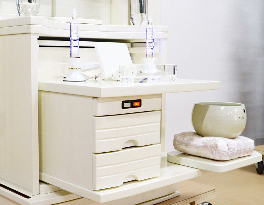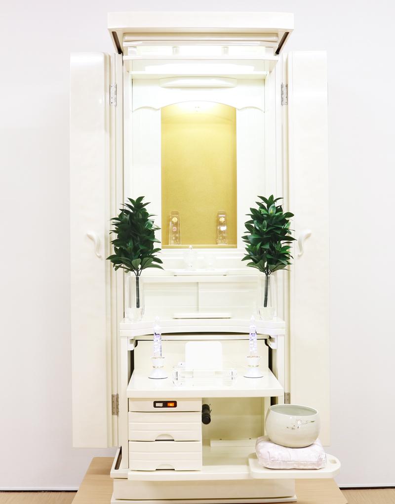 国産優良人気家具調仏壇になります。最高級のホワイトパール塗装はグラディエーションの特殊加工が施されています。 家具調ながら大きくご本尊い包まれるそんな優しい豊かさのある仏壇に仕上がっています。会場拠点用にお勧めできる荘厳で優雅な仏壇「遥・パールホワイト」です。