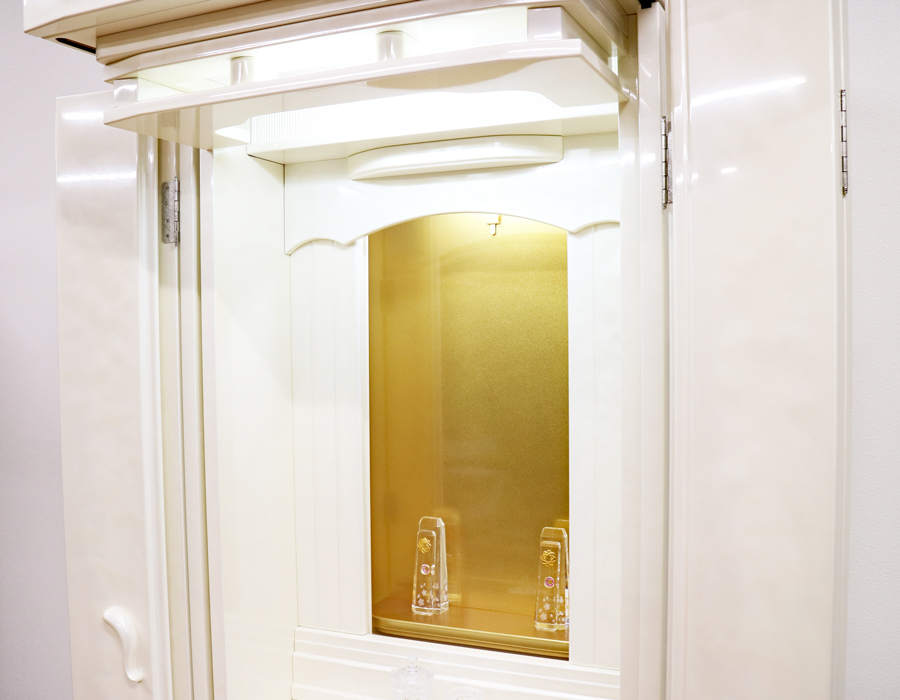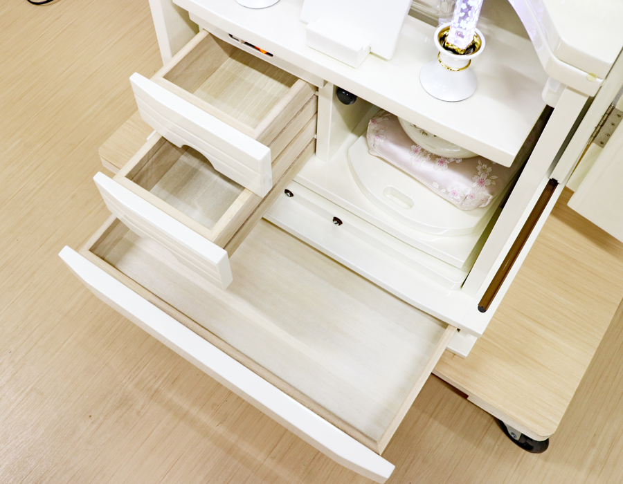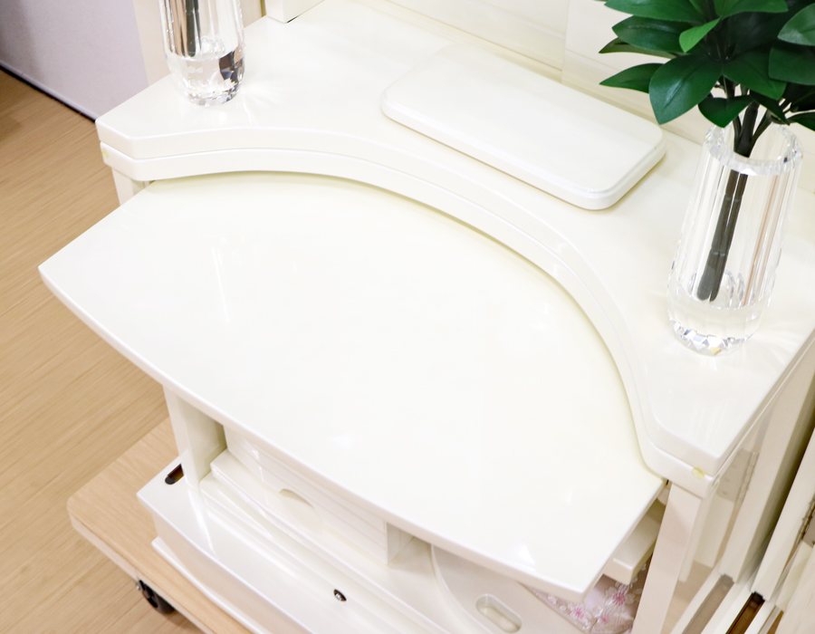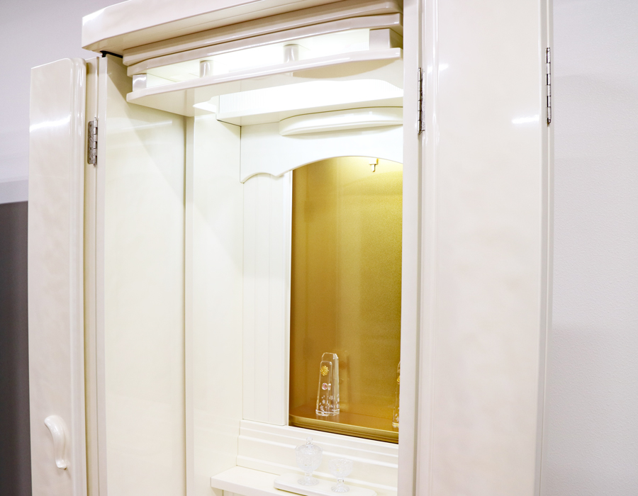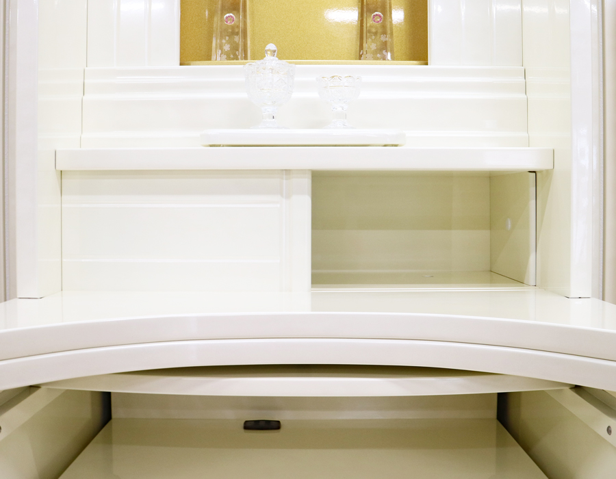 お仏壇全体の塗装は上記お写真のように、グラデーションのあるパールホワイト塗装に仕上がっております。