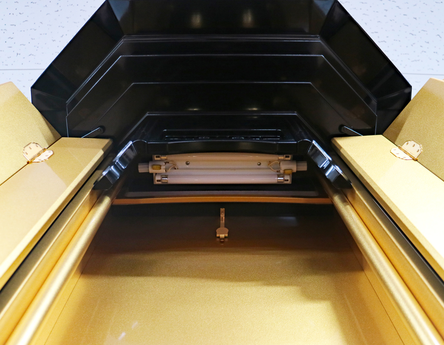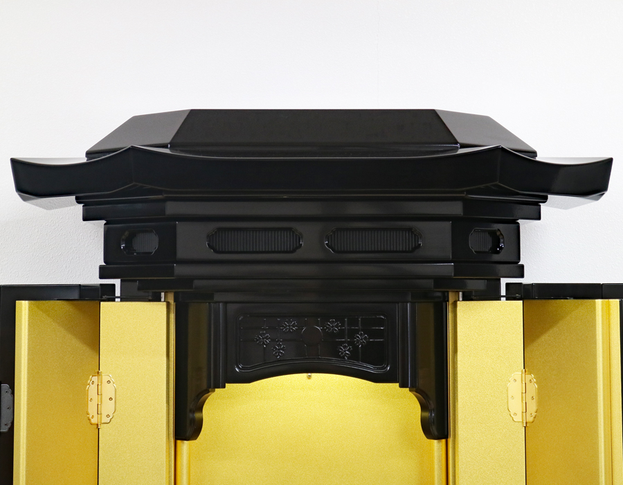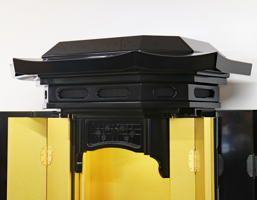 お厨子を開くと美しくクリア金色塗装を施した厨子板がご本尊様をさらに荘厳にしてくれます。 内部には蛍光灯照明も付属していますのでご本尊様を明るく照らしてくれます。