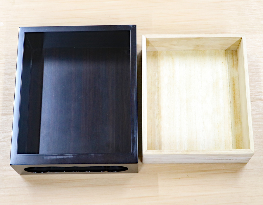 中の色の薄い箱は桐箱で作成しております。