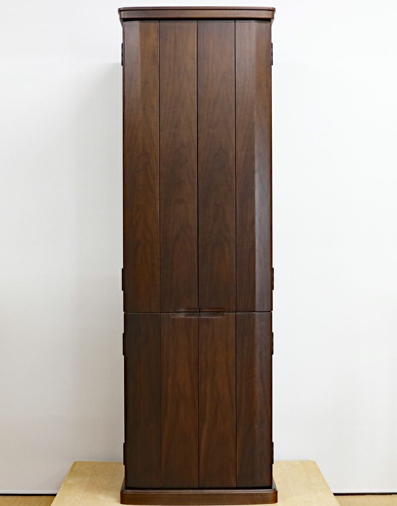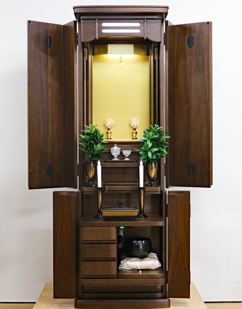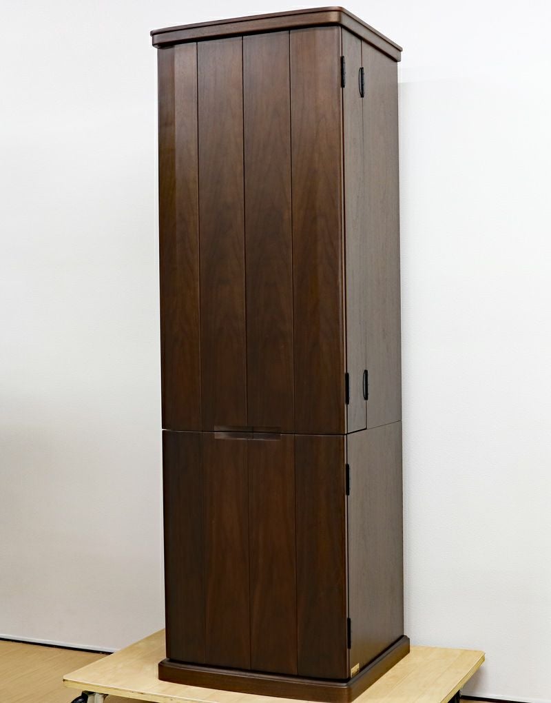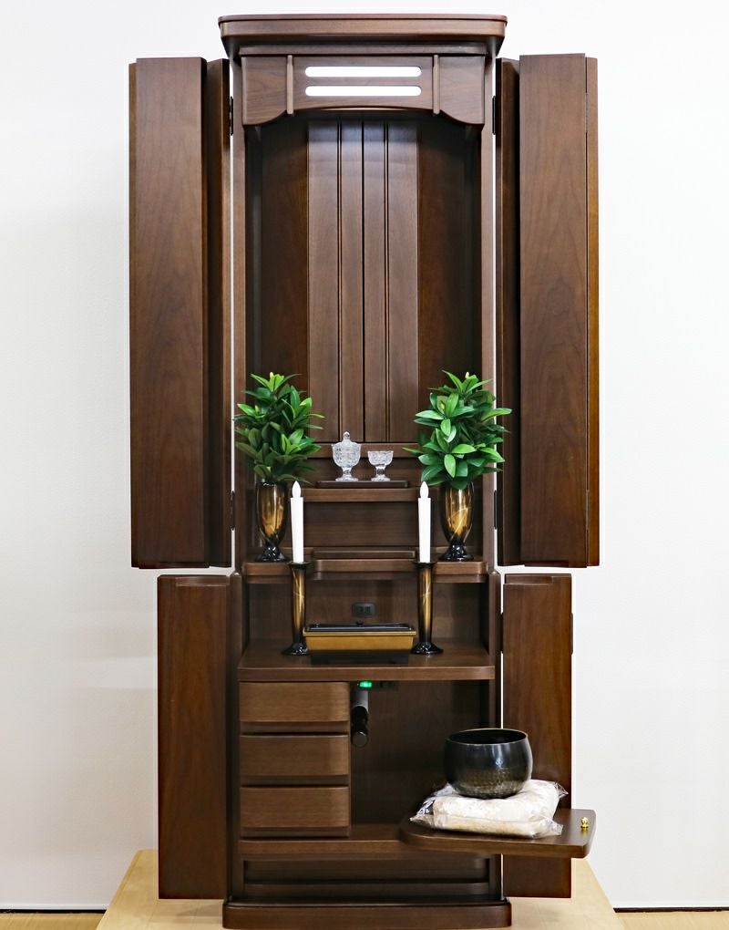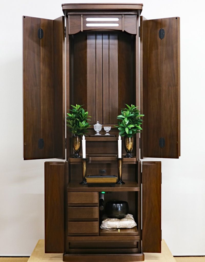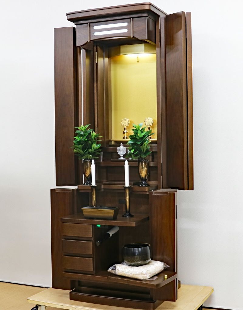 ウォールナット材を使用した、木のぬくもりを感じるおしゃれなデザインの家具調中古仏壇です。 三方開き式の大戸ですので、開くことによって視野が広がり斜めからでもご本尊様を拝すことができます。 和室・洋室・リビングダイニングにも最適です。