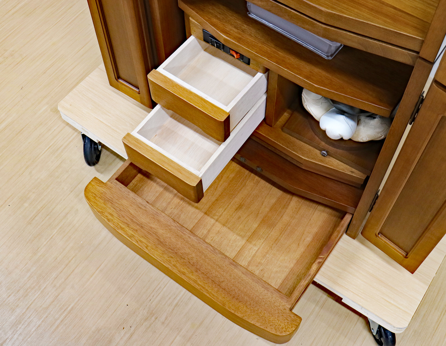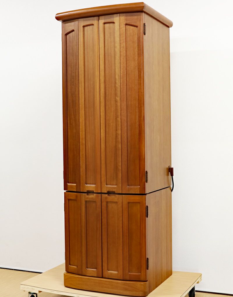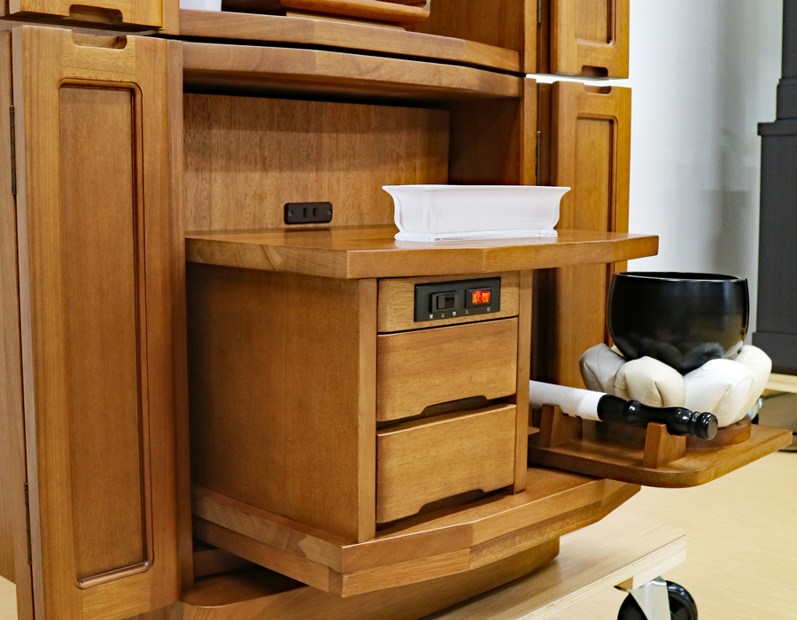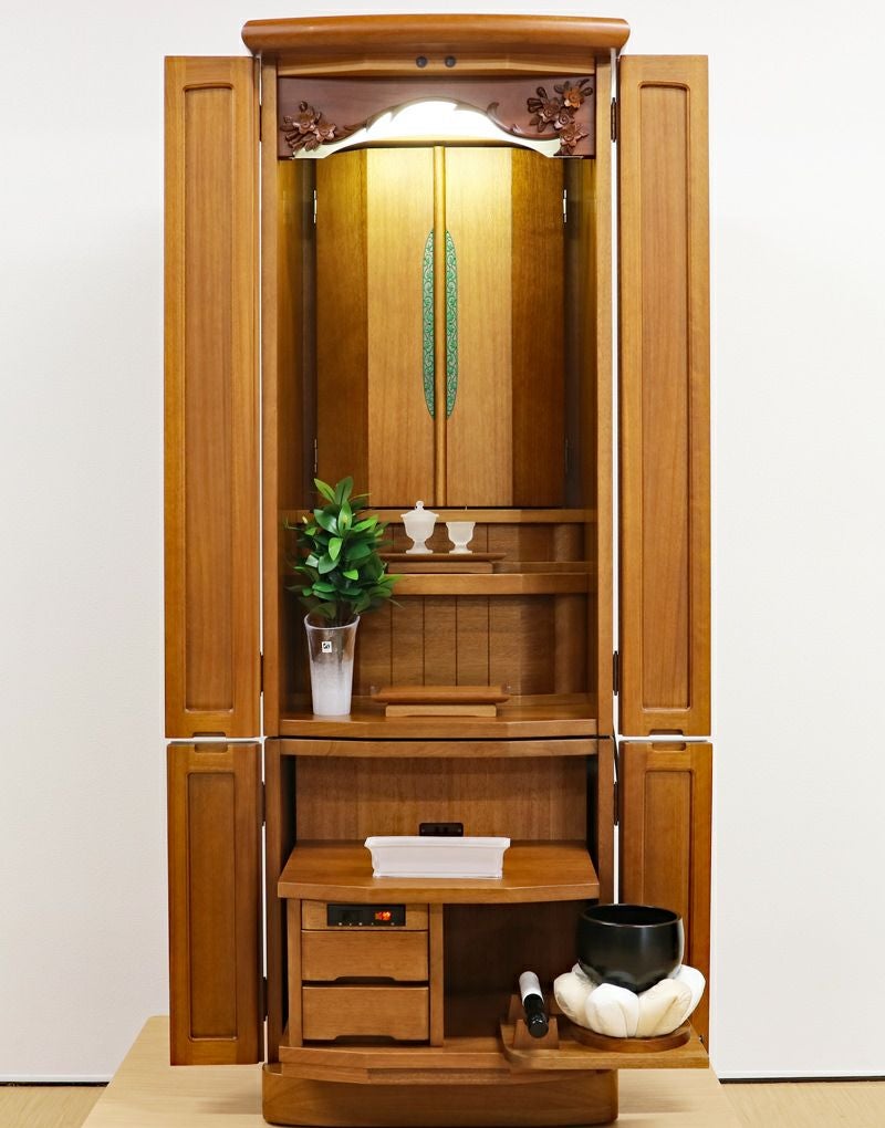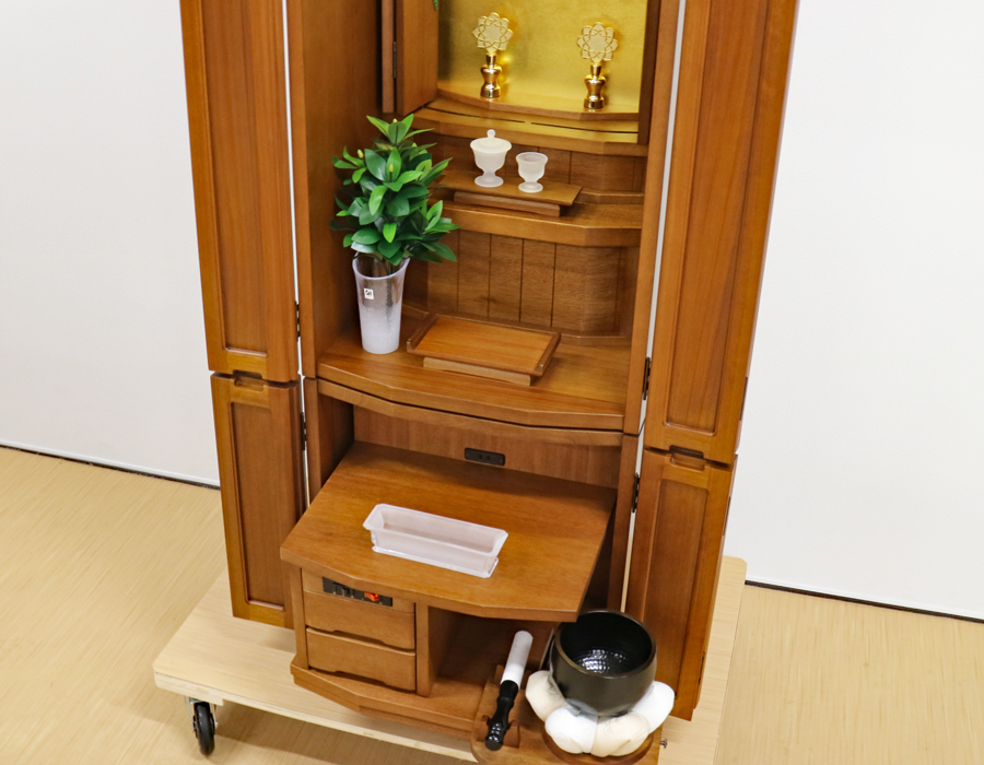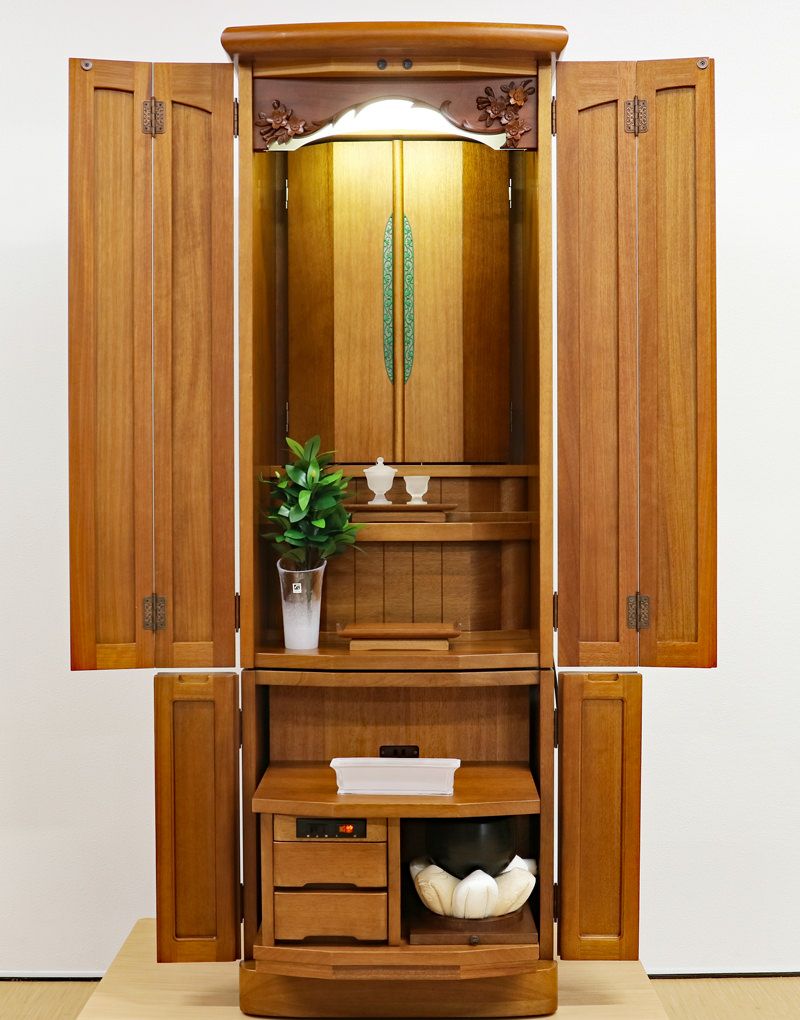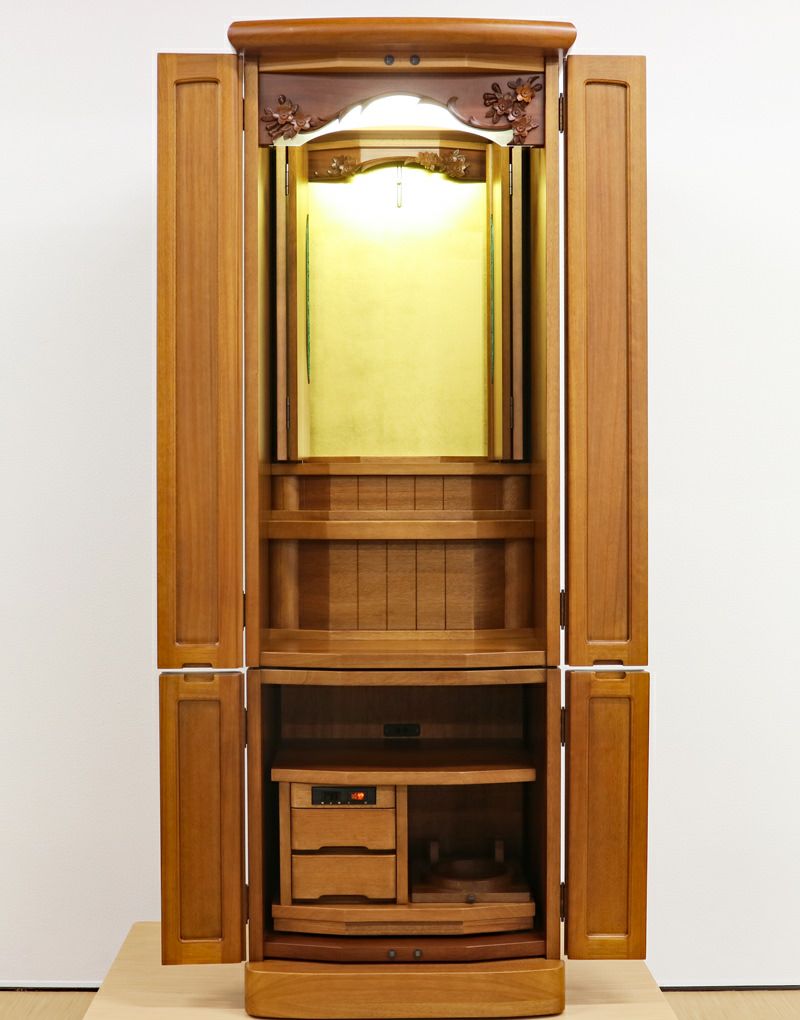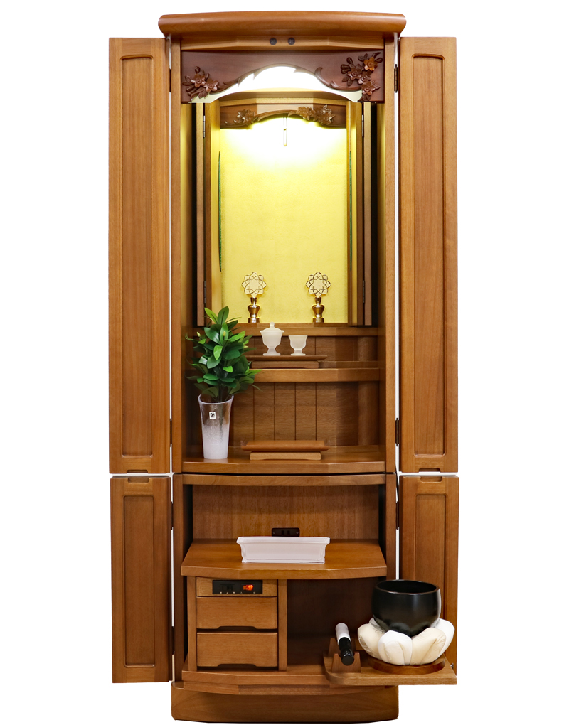 落ち着いた木のやさしさを感じるお仏壇です。無垢板を使用しているので、年数とともに色合いが変わり味が出てきます。婦人部女子部に大人気の商品です。扉が2箇所に分けられていますので、厨子だけ開閉ができスマートにご安置できます。