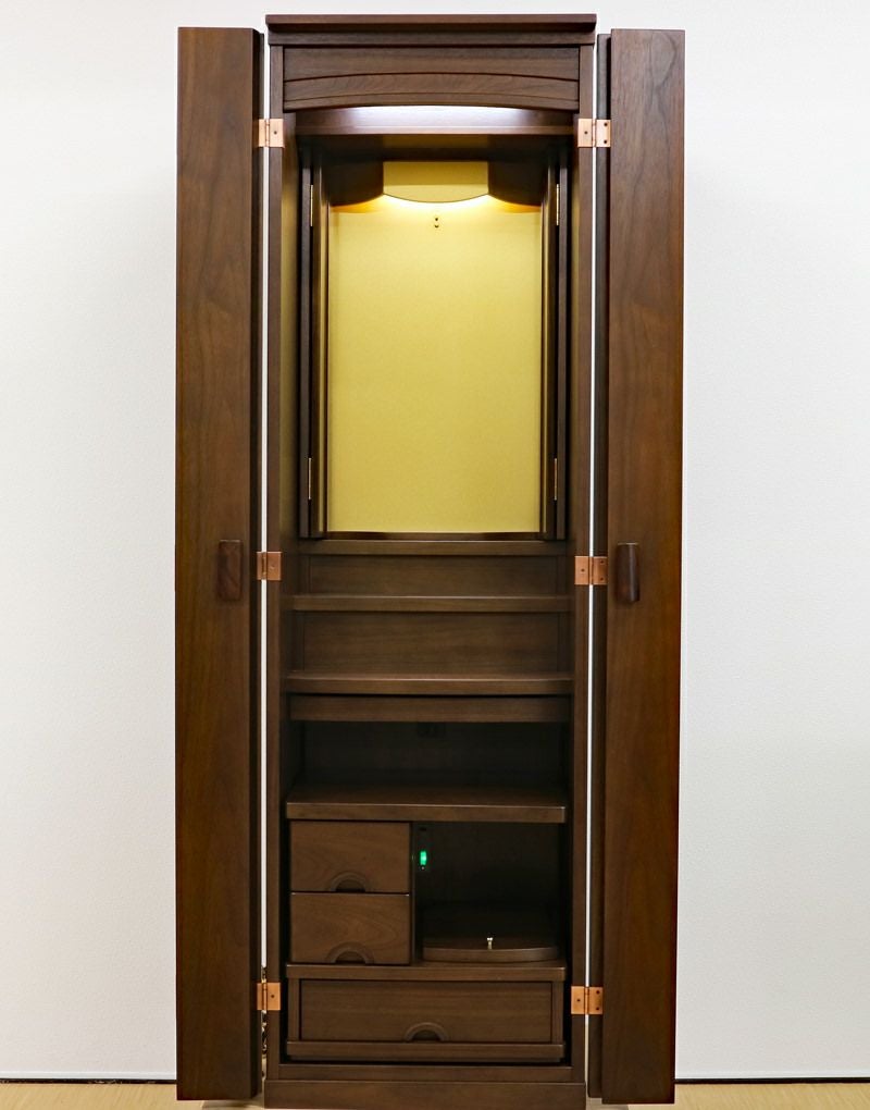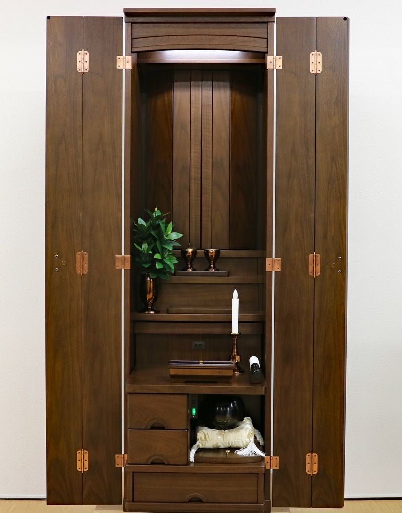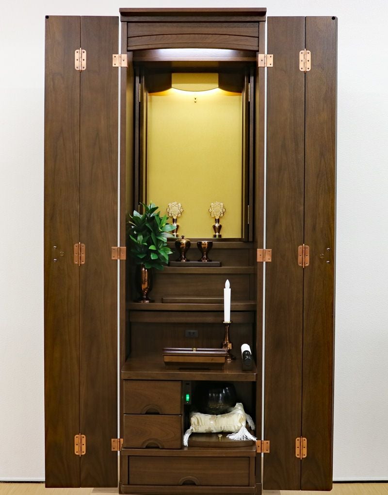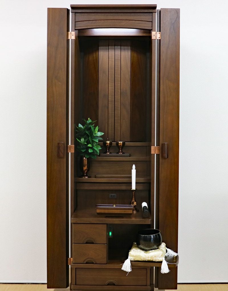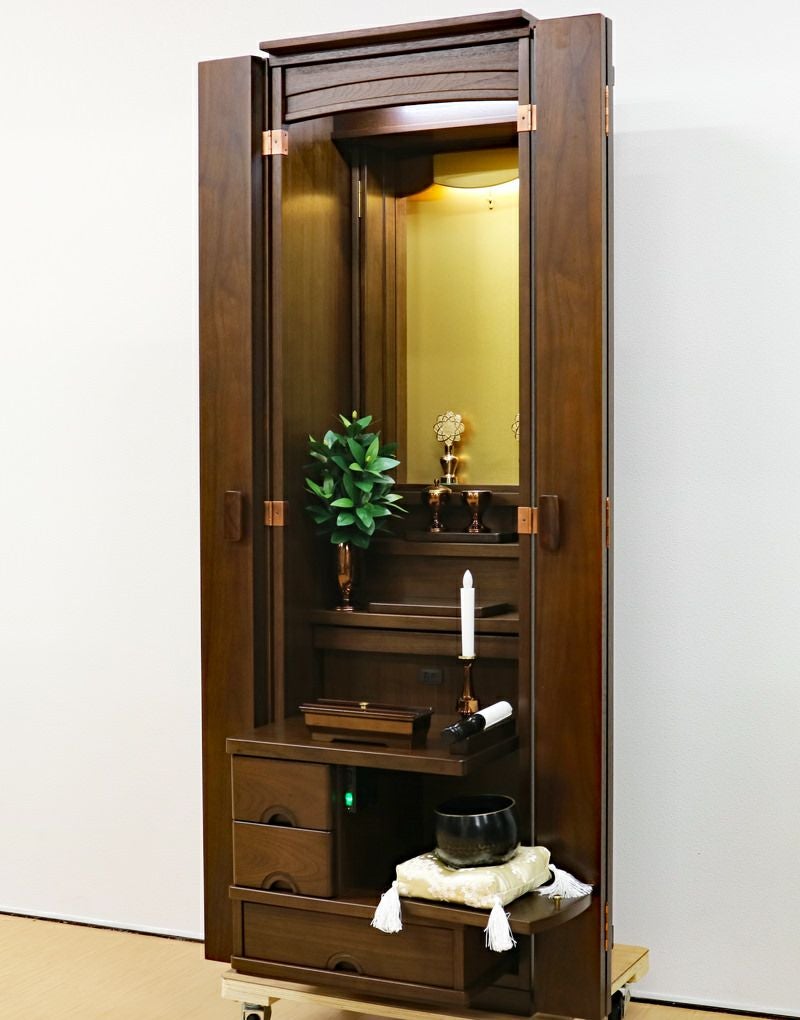ポプラ材の無垢・ウォールナット材の薄板を使用した、暖かみのあるお色味のお仏壇となります。 和室・洋室・リビングダイニングにも最適です。新品はこちらになります。