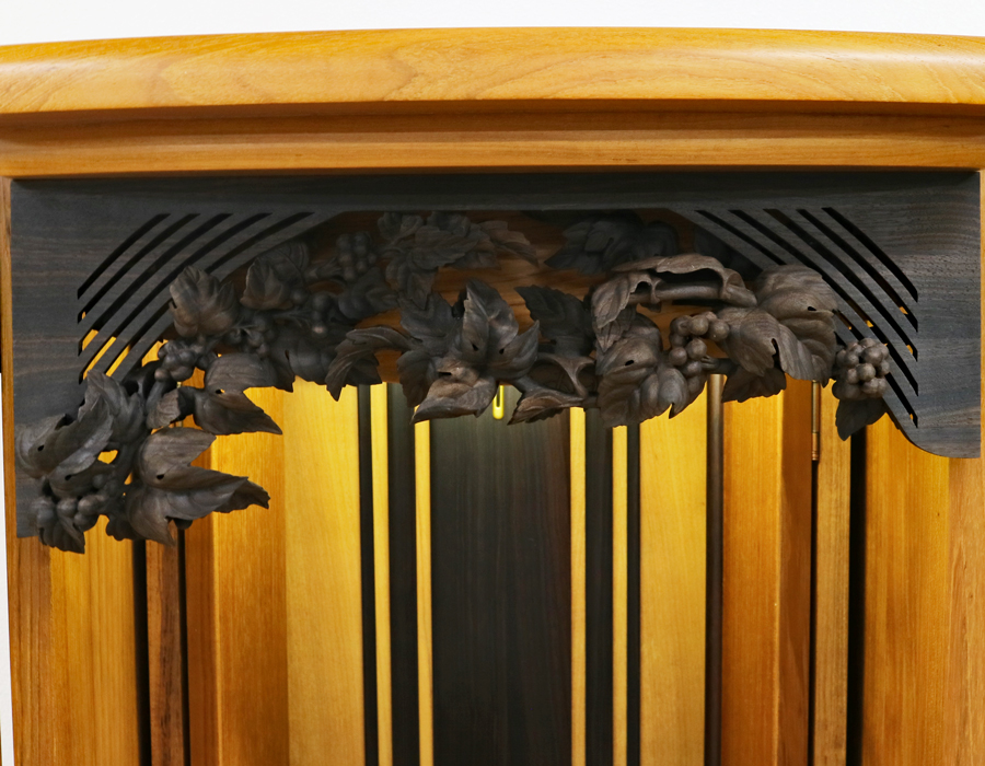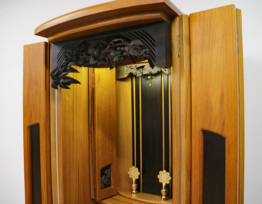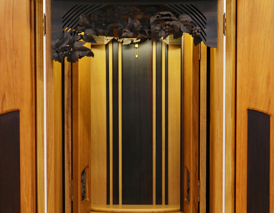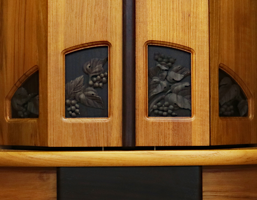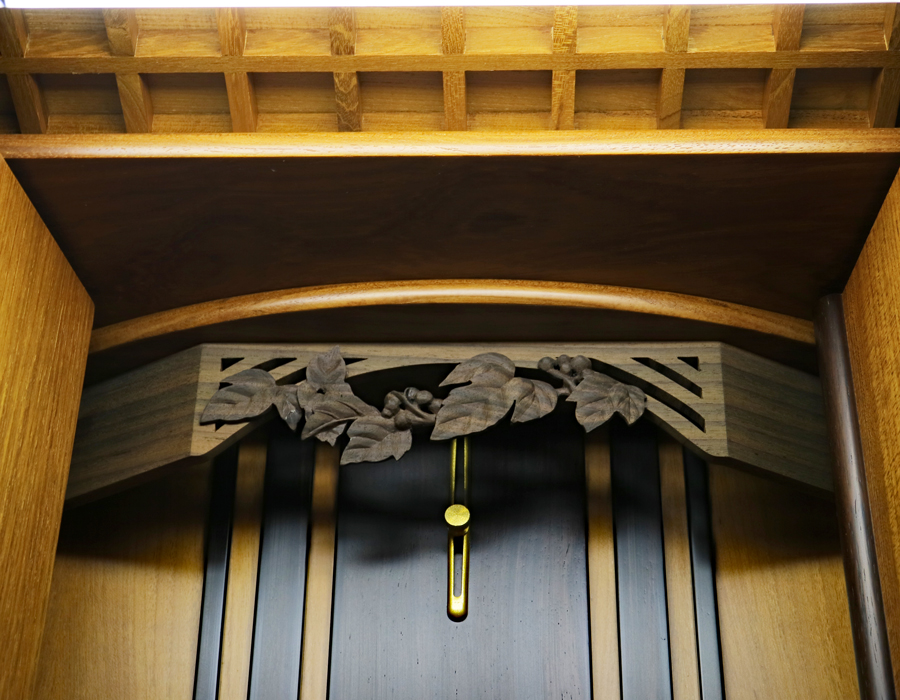 欄間同様に、厨子扉にも本黒檀無垢による、野ぶどうの彫刻が施されております。
