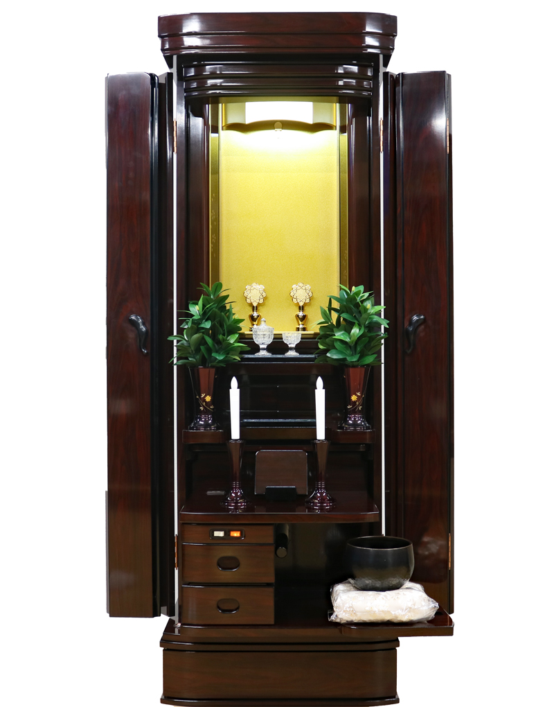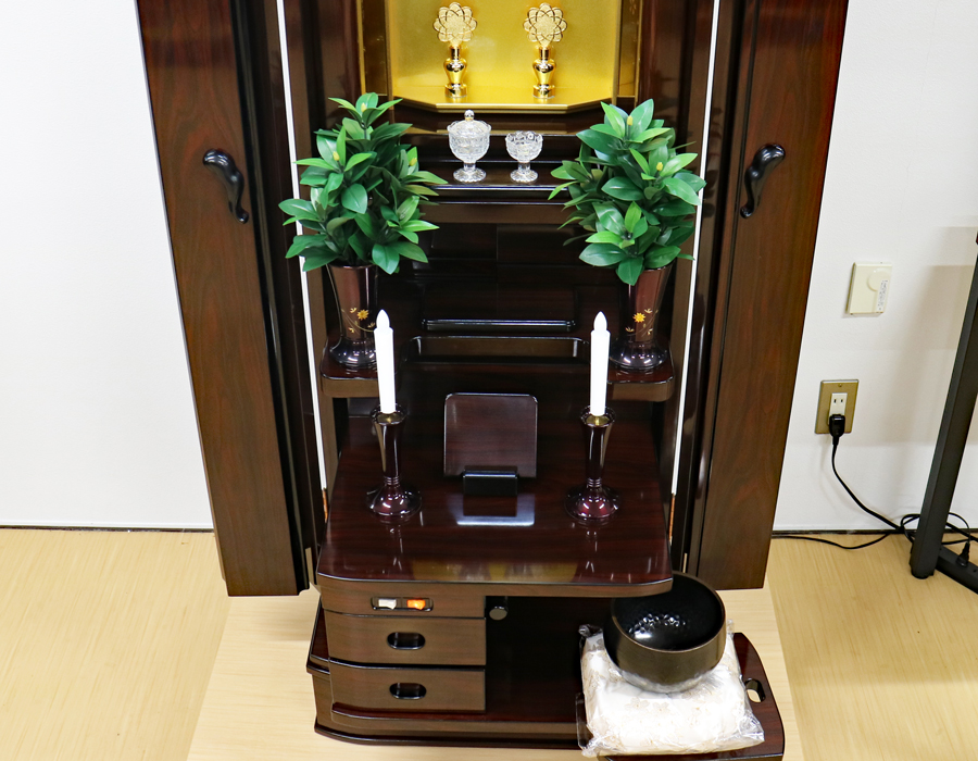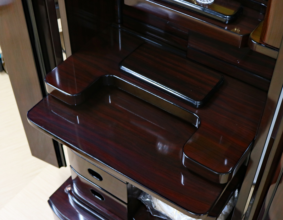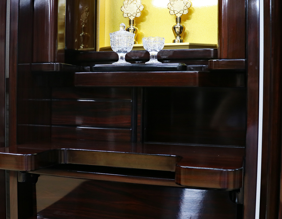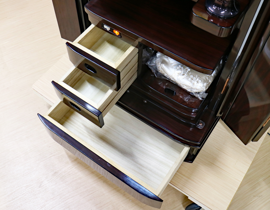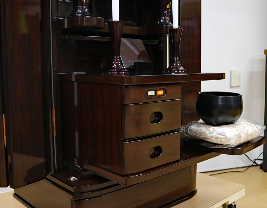 仏壇下部に3か所引き出しがございますのでお経本・念珠など充分に収納できます。