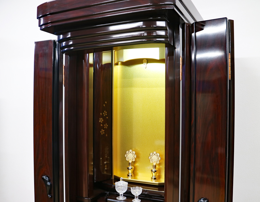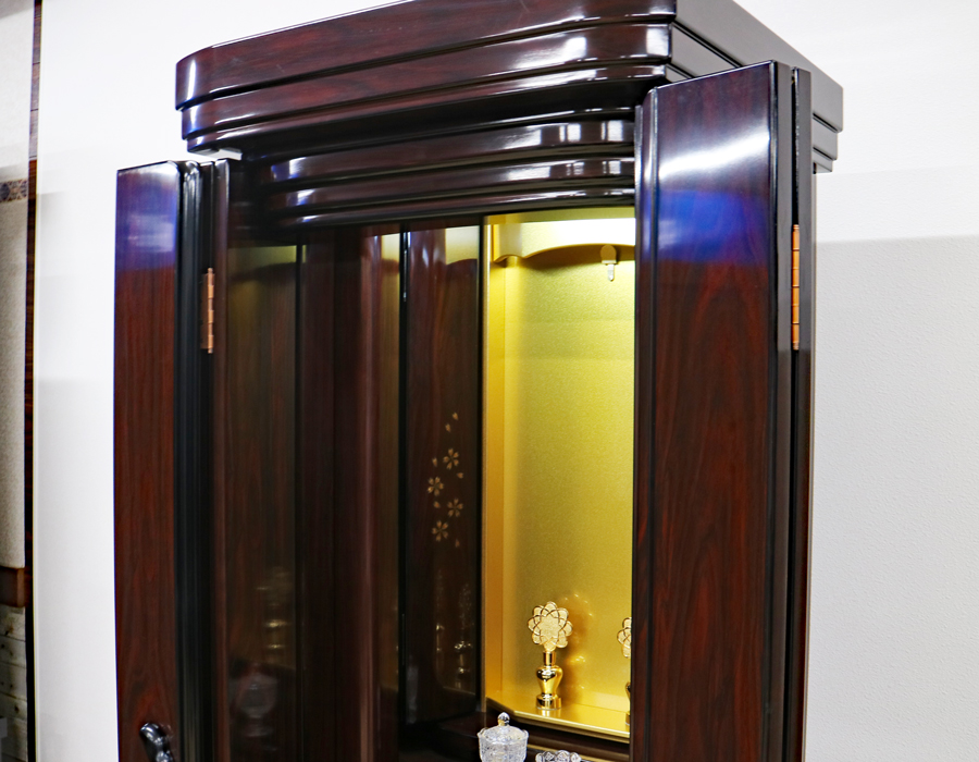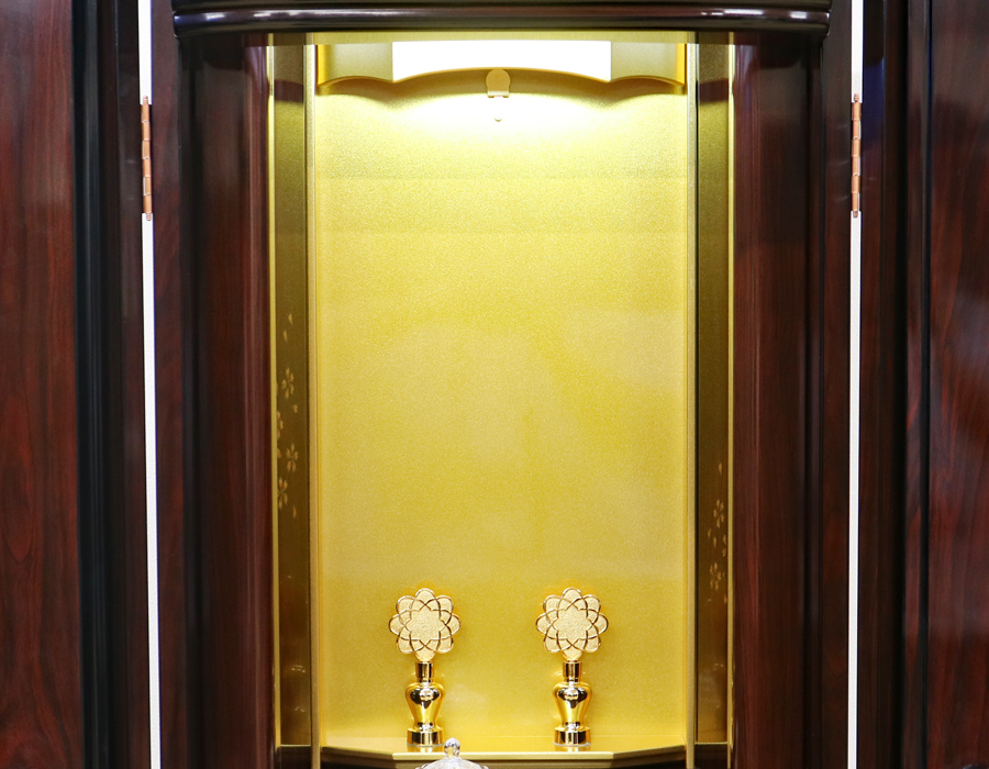 お厨子を開くと美しくクリア金色塗装厨子板がご本尊様をさらに荘厳にし、LED照明で仏壇内も適度に明るく照らしてくれます。