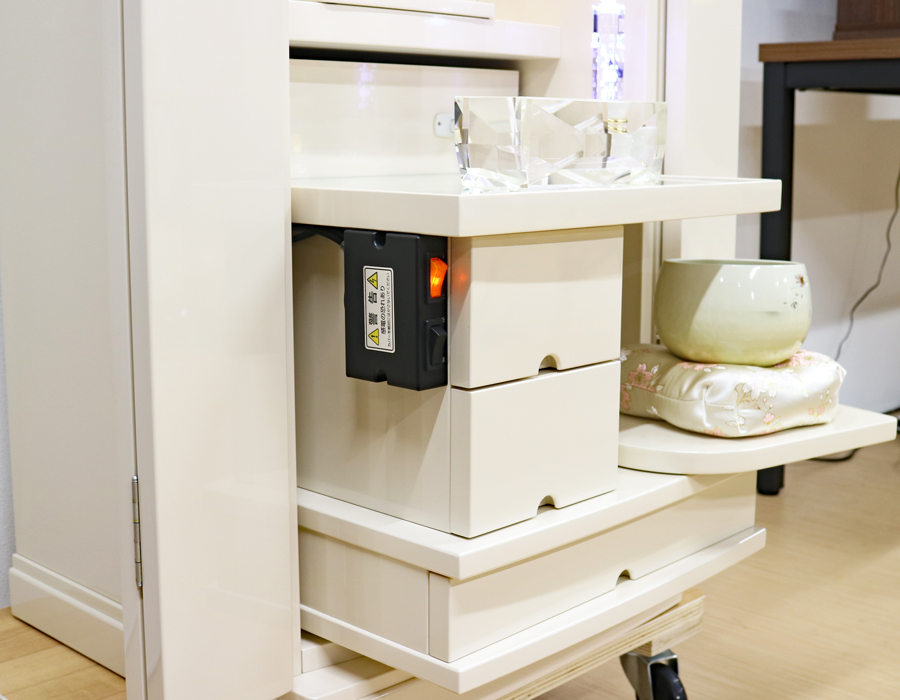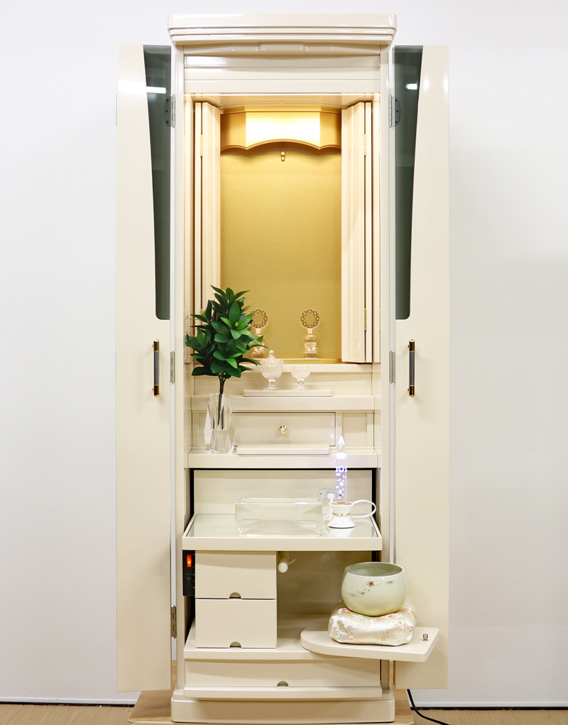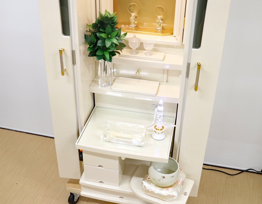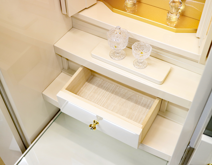 仏壇下部に3か所引き出しがございますのでお経本・念珠など充分に収納できます。