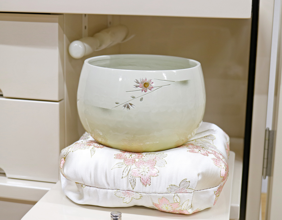 仏具付きを選択の場合、上記お写真の彫金入りのホワイトリンが付属いたします。