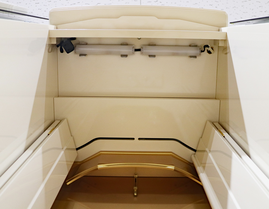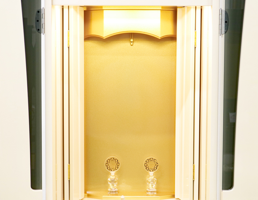 お厨子を開くと美しくクリア金色塗装厨子板がご本尊様をさらに荘厳にし、LED照明で仏壇内も適度に明るく照らしてくれます。