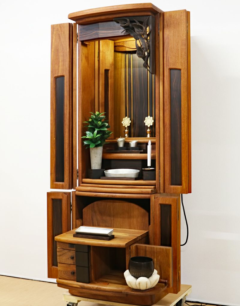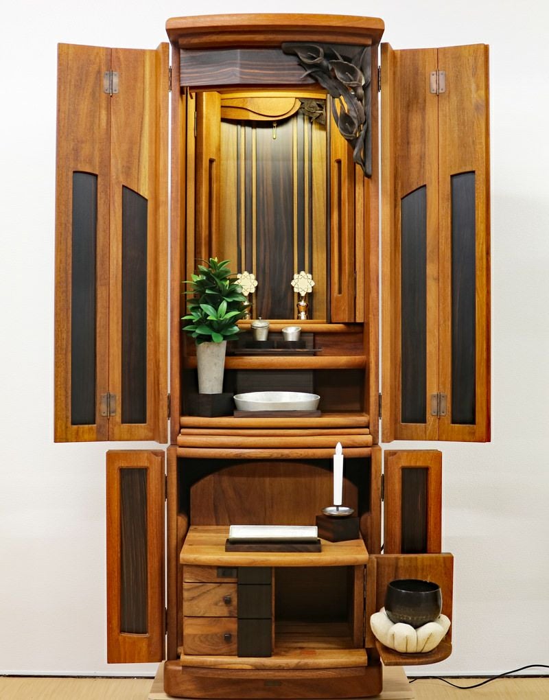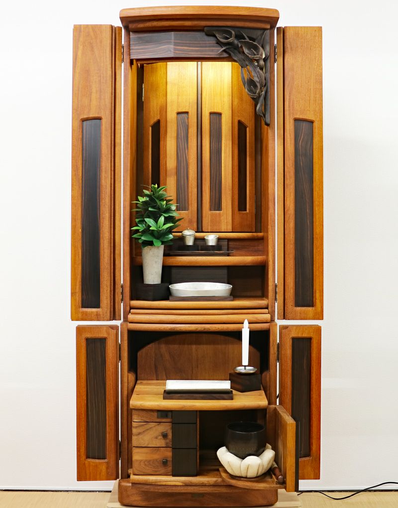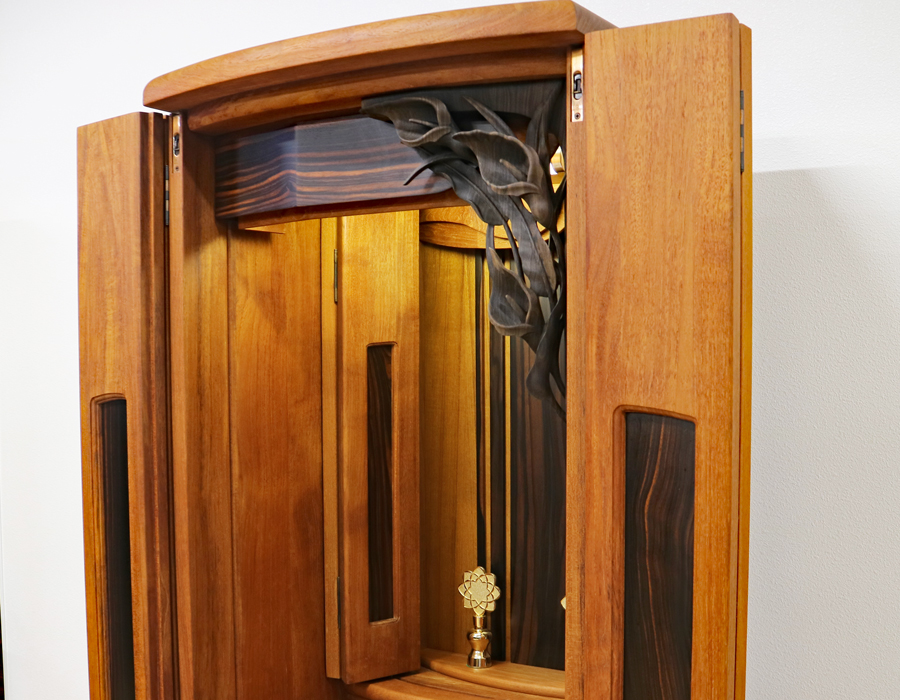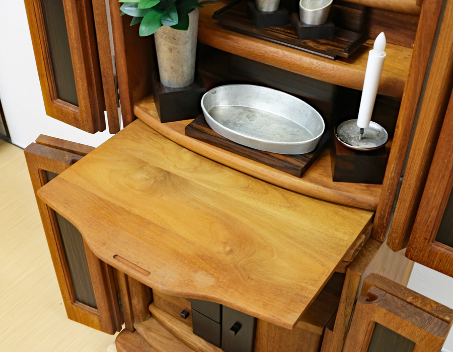 チーク材をふんだんに使用したお仏壇です。無垢板を使用しているので、年数とともに色合い味が出ております。 黒檀の大型のユリの彫が最大の特徴になっています。