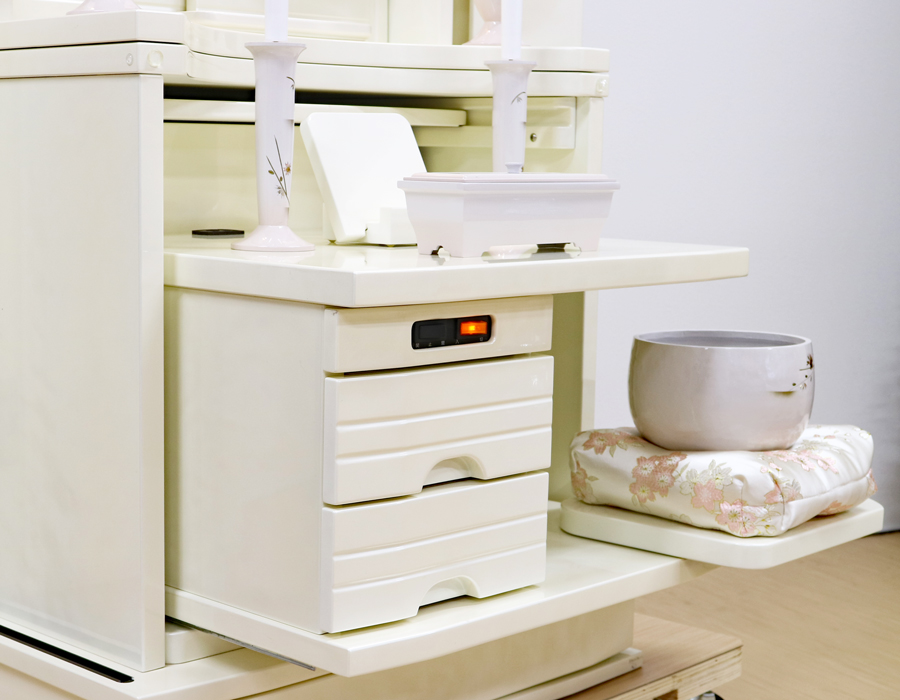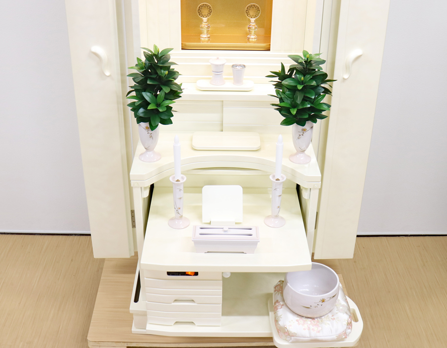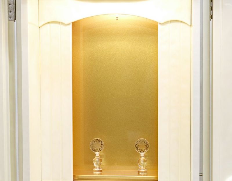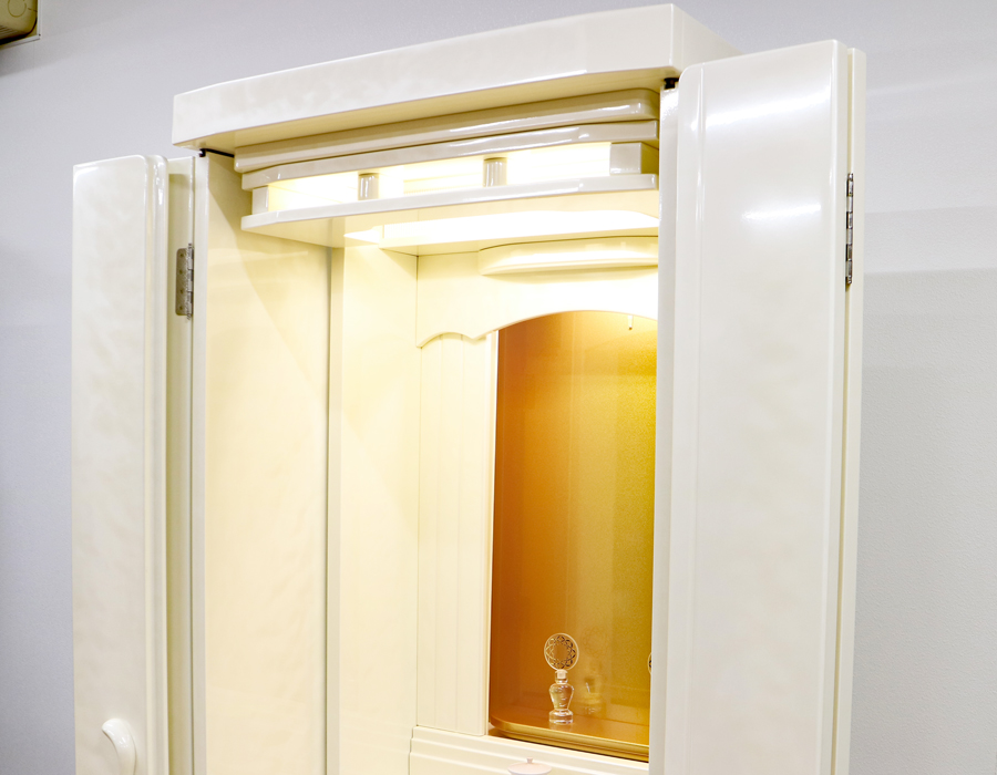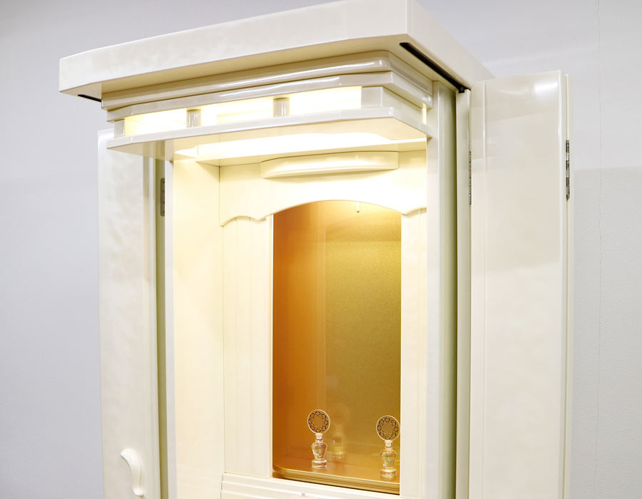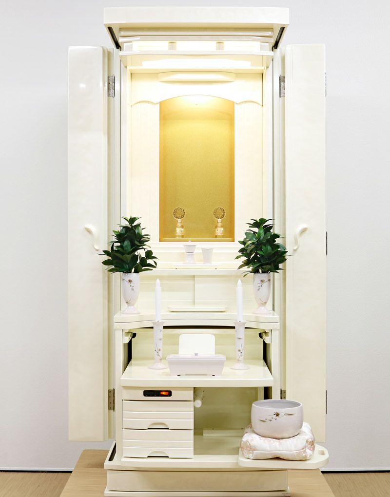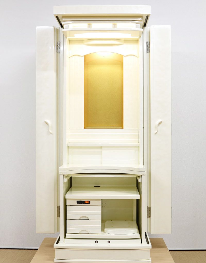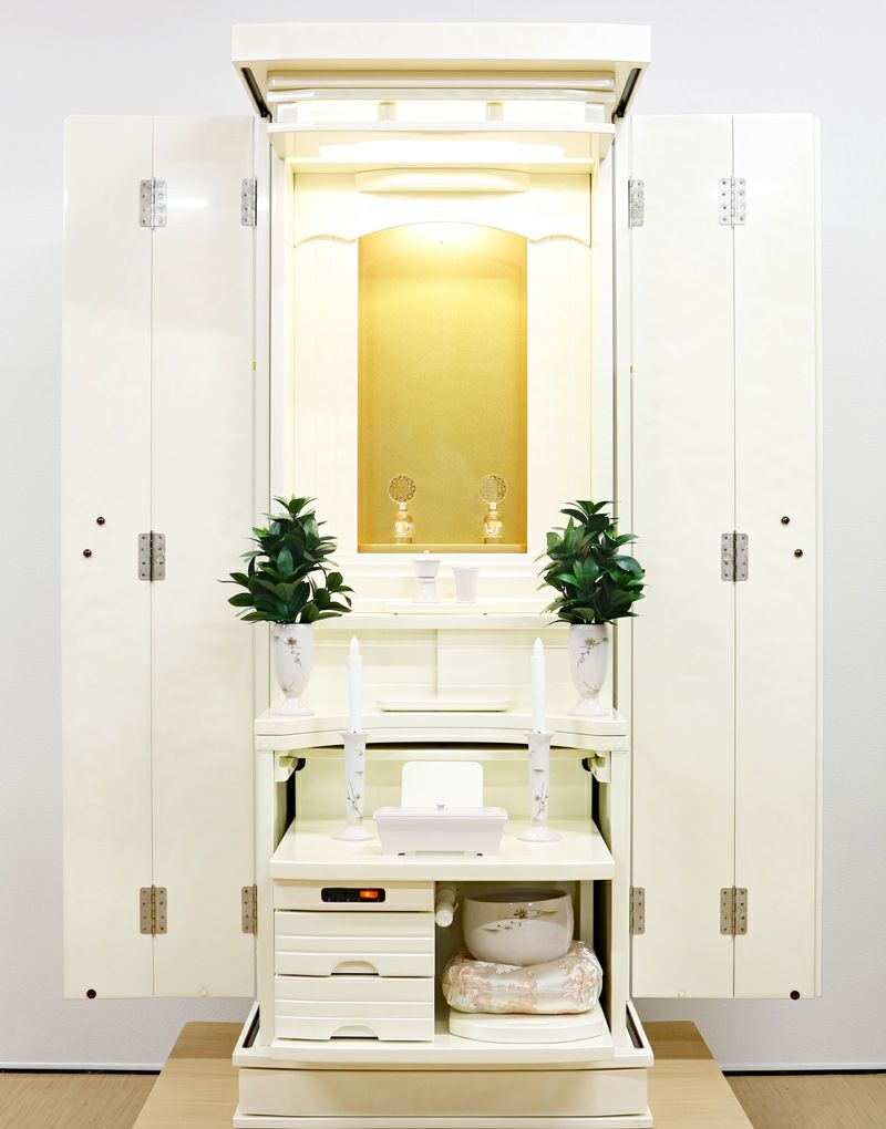国産優良人気家具調仏壇になります。最高級のホワイトパール塗装はグラデーションの特殊加工が施されています。 家具調ながら大きくご本尊い包まれるそんな優しい豊かさのある仏壇に仕上がっています。会場拠点用にお勧めできる荘厳で優雅な仏壇「遥・パールホワイト」です。