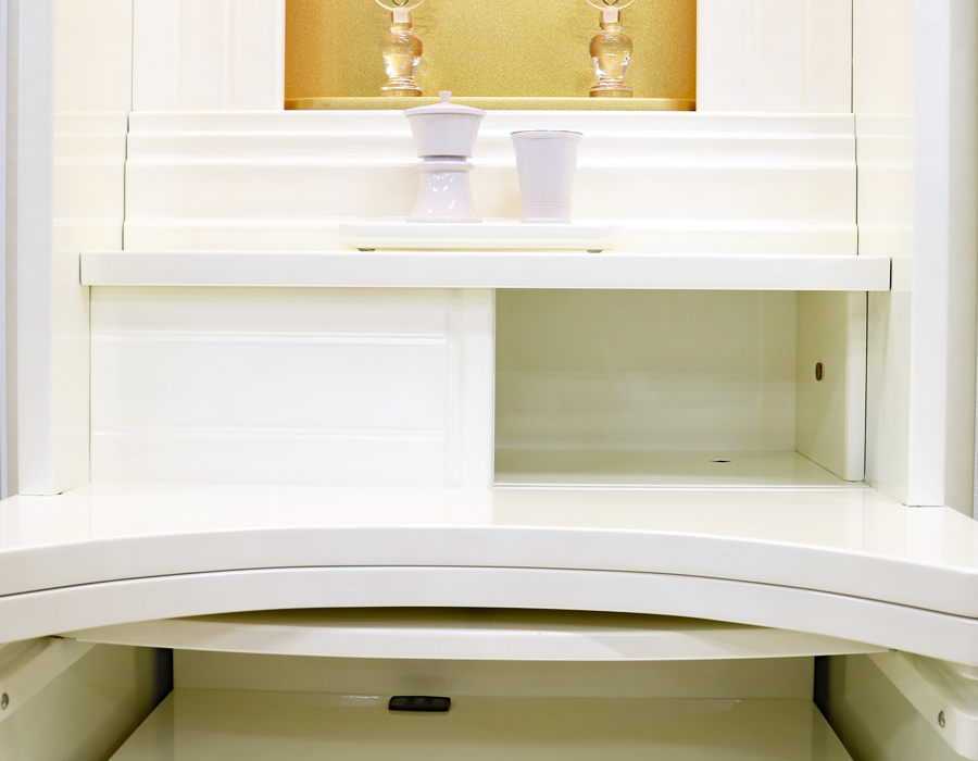 お仏壇全体の塗装は上記お写真のように、グラデーションのあるパールホワイト塗装に仕上がっております。