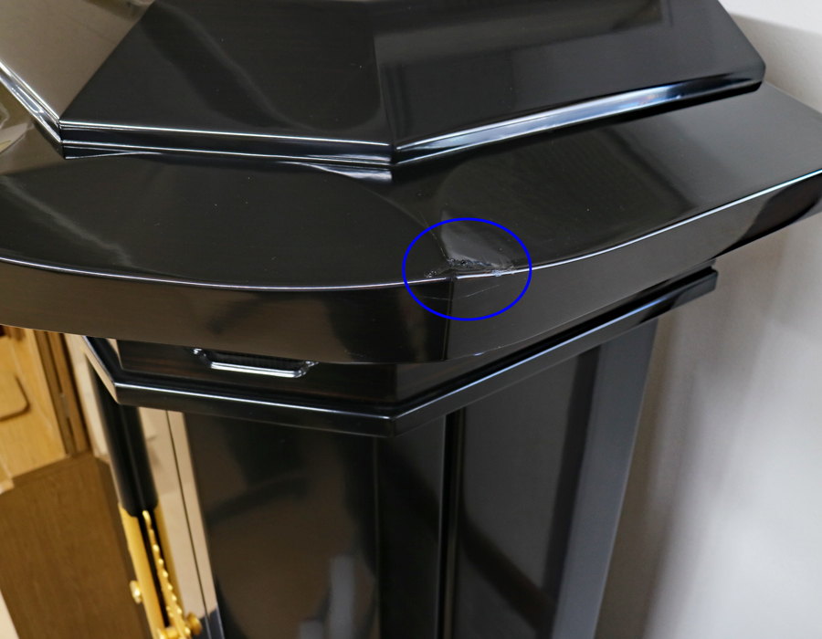 大戸の角に経年劣化による薄いひびがあるためB級仏壇として格安にて提供させていただきます。詳細は下記お写真をご覧ください。