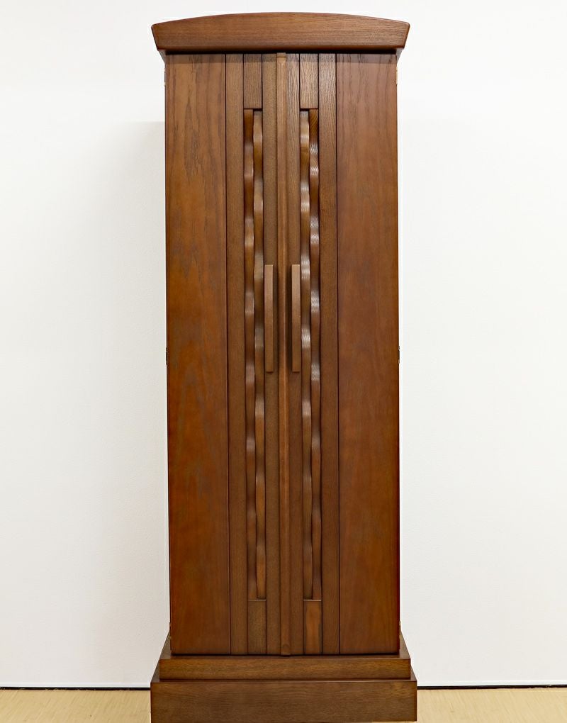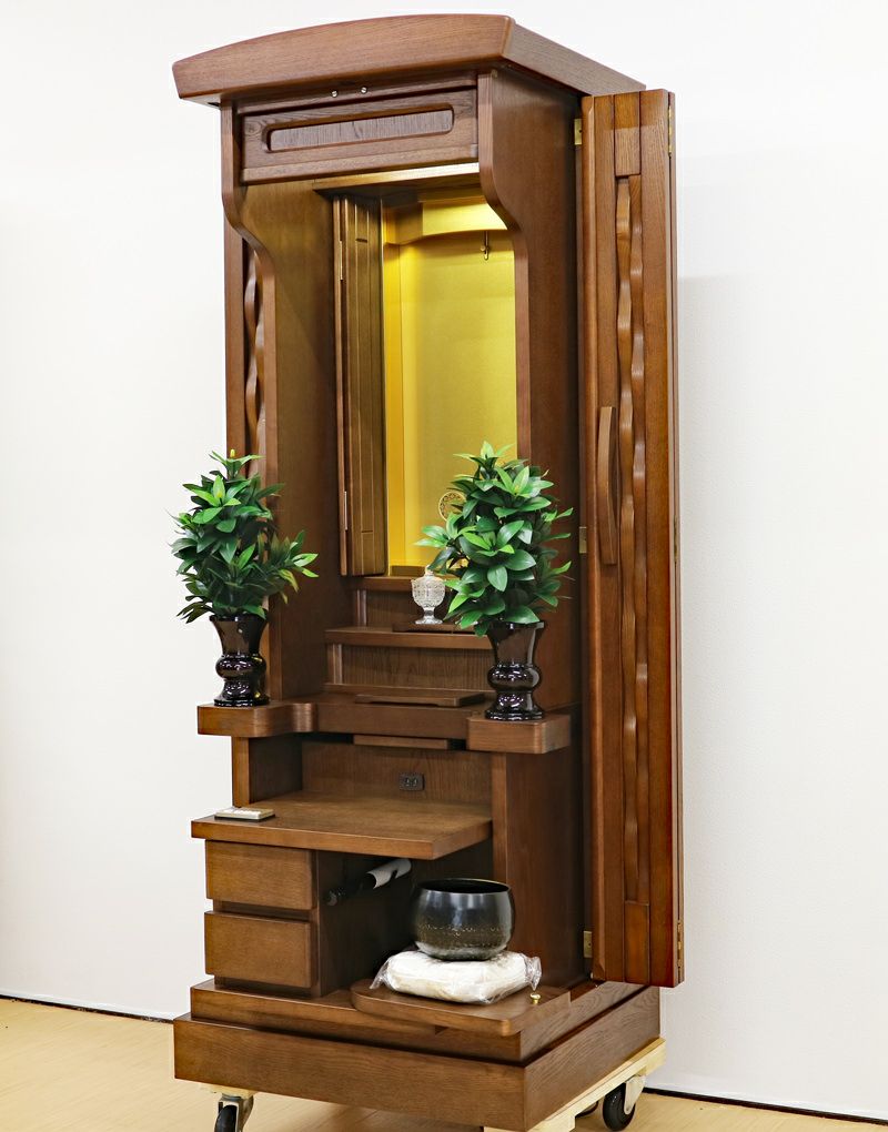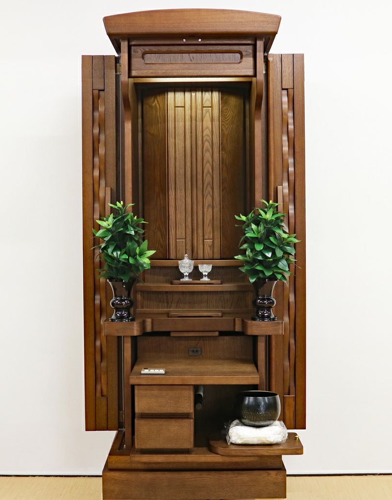木のぬくもりを感じるアンティークな感じのおしゃれなデザインの家具調中古仏壇です。 押し込み式の大戸ですので、押し込むことによって斜めからでもご本尊様を拝すことができます。 和室・洋室・リビングダイニングにも最適です。