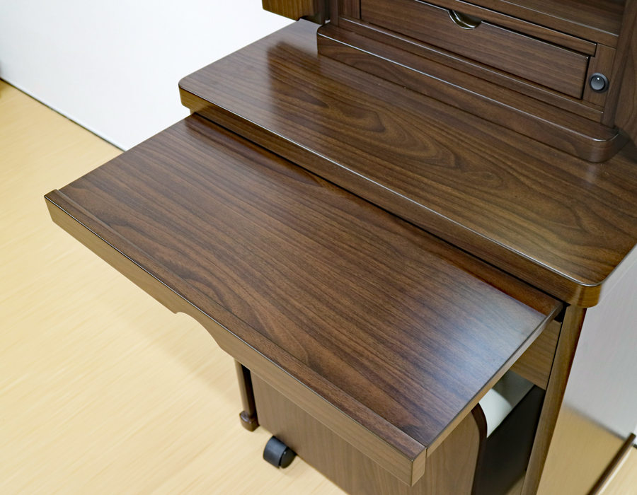 下台に大きめの膳引きがございますので、ご祈念帳・過去帳・また聖教新聞や大百蓮華を広げてお題目があげられます。