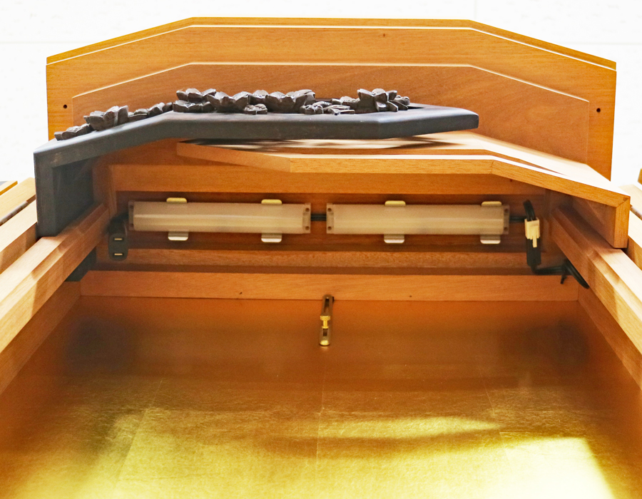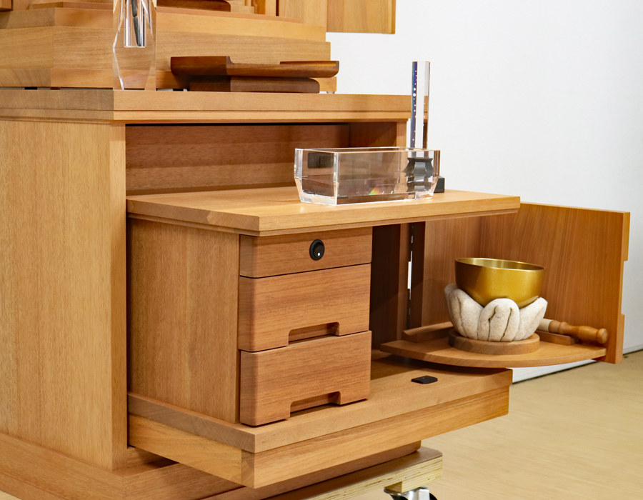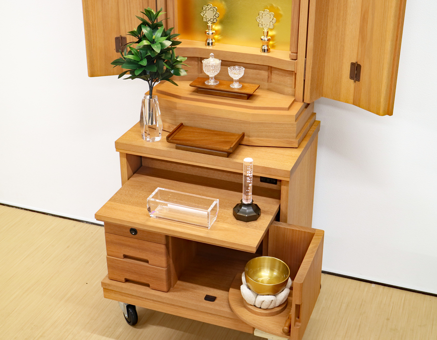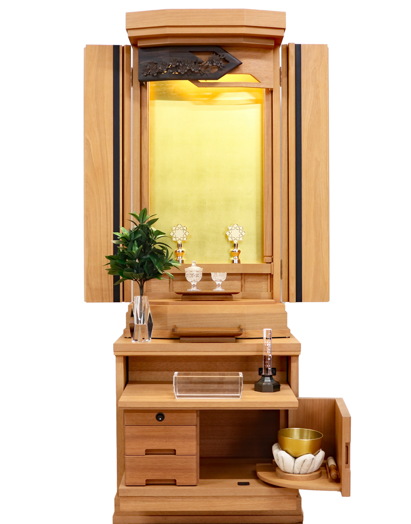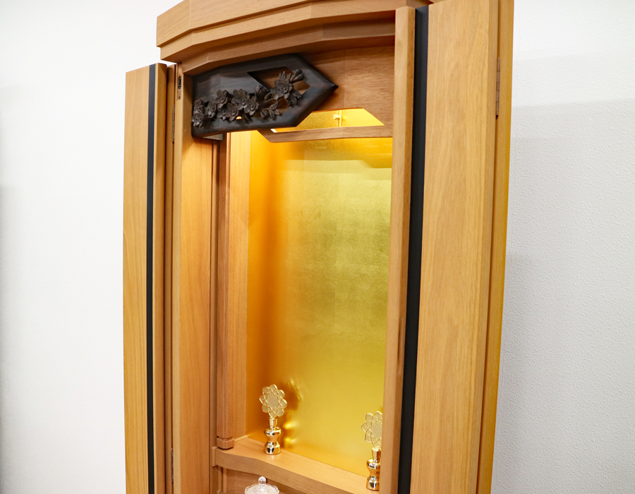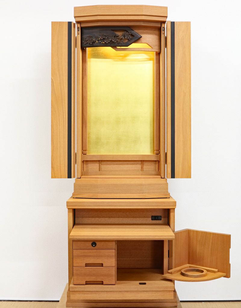 大戸が三方開きになるお仏壇ですので、三方開きにすると視野が広がり斜めからでも御本尊様を拝すことができます。