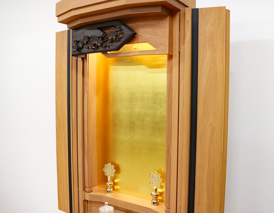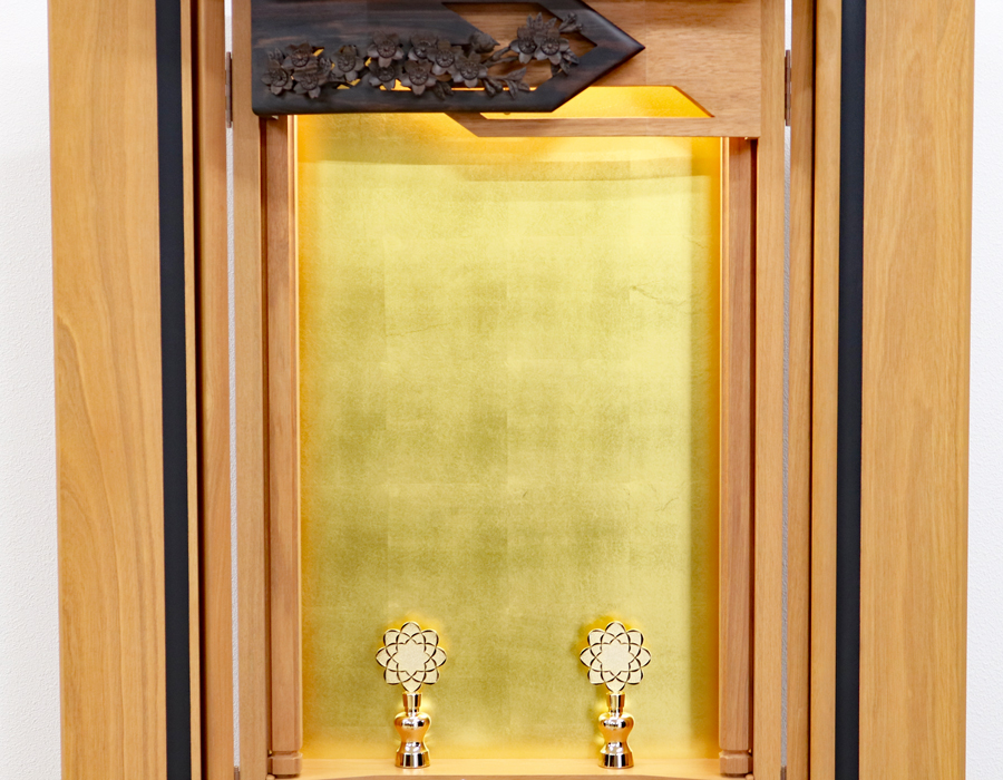 本金箔と金色塗装では輝きが違うのは一目瞭然です。 内部にはLED照明も付属していますのでご本尊様を明るく照らしてくれます。