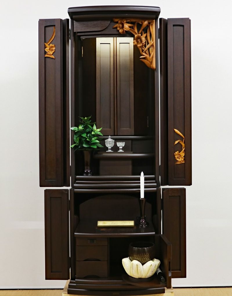 大戸が三方開きになるお仏壇ですので、三方開きにすると視野が広がり斜めからでも御本尊様を拝すことができます。
