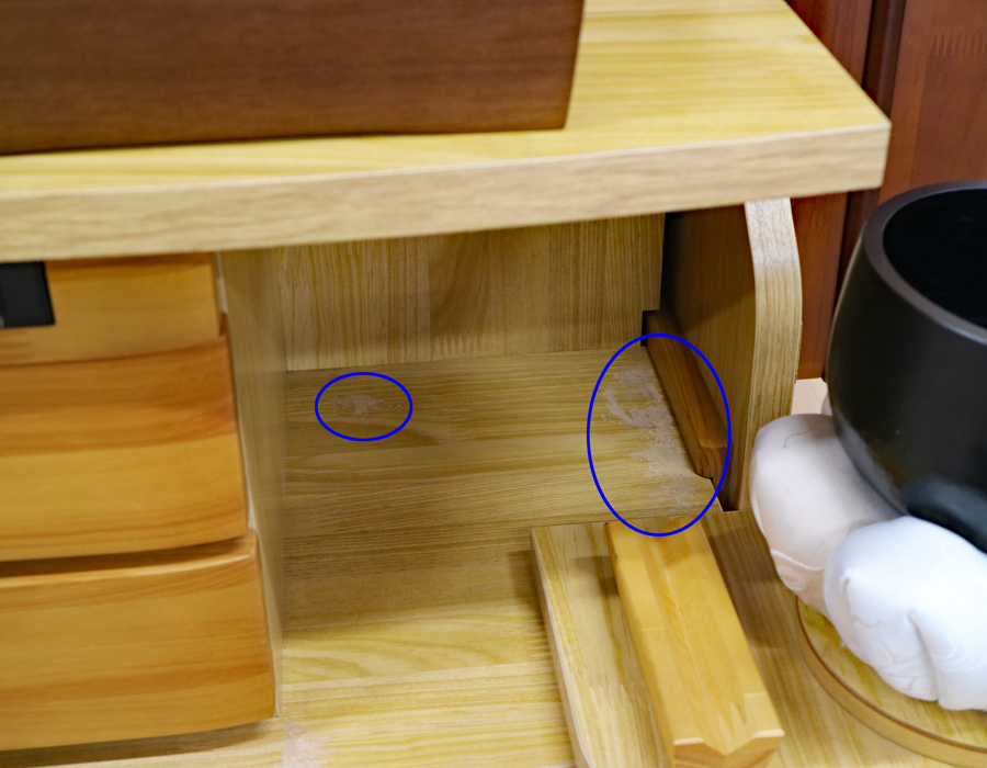 収納リン台に擦り傷が見られますのでB級仏壇として格安にてご提供させていただきます。