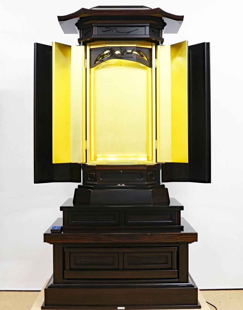 本金箔と金色塗装では輝きが違うのは一目瞭然です。 内部には蛍光灯照明も付属していますのでご本尊様を明るく照らしてくれます。