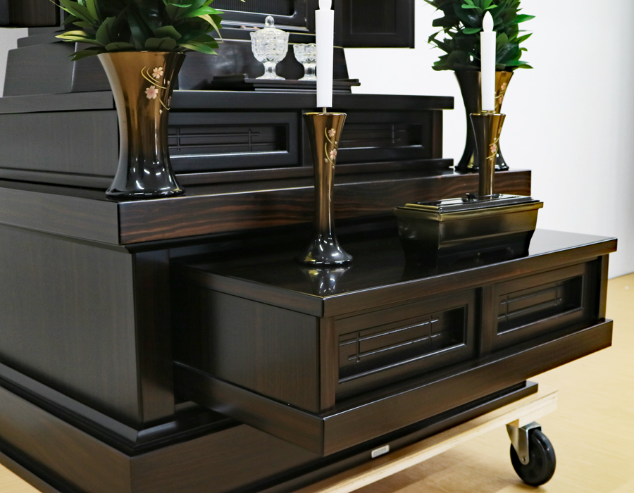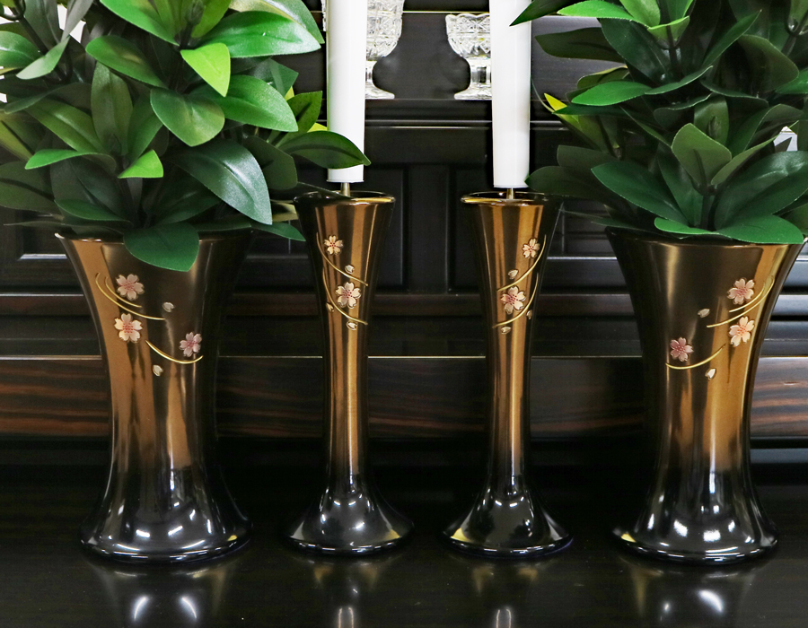 仏具付きを選択の場合、銅器生産で有名な高岡製の桜彫金入り銅器ボカシ仏具セットが付属いたします。