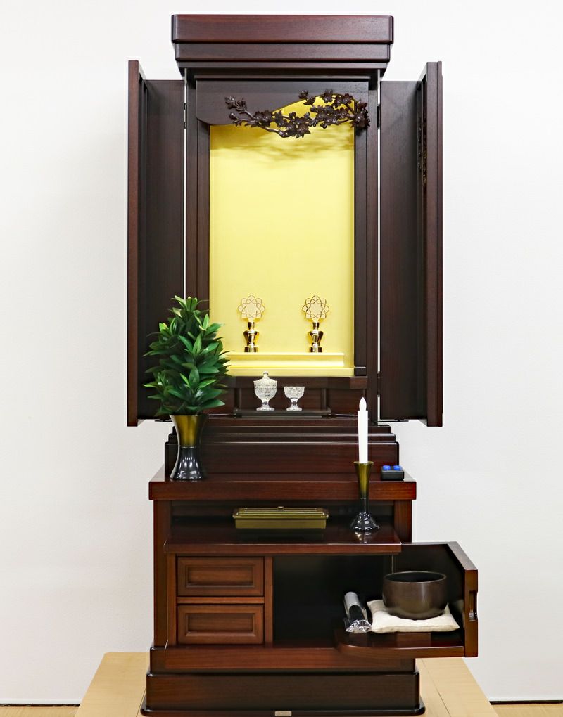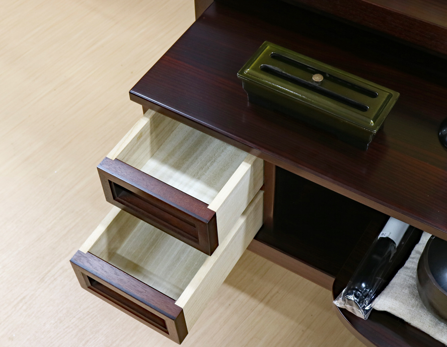 お厨子内は本金箔仕様でご本尊様をより荘厳することができます。仏壇製造で有名な徳島県産のお仏壇です。 *ソノクリン材はまたの名を紫檀:ローズウッドと呼ばれる高級銘木材です。 重硬な気質と、特徴のあるその木目や赤紫系の色味が、希少価値の高さになります。 加工性や耐久性も高く粘りが強い材です。