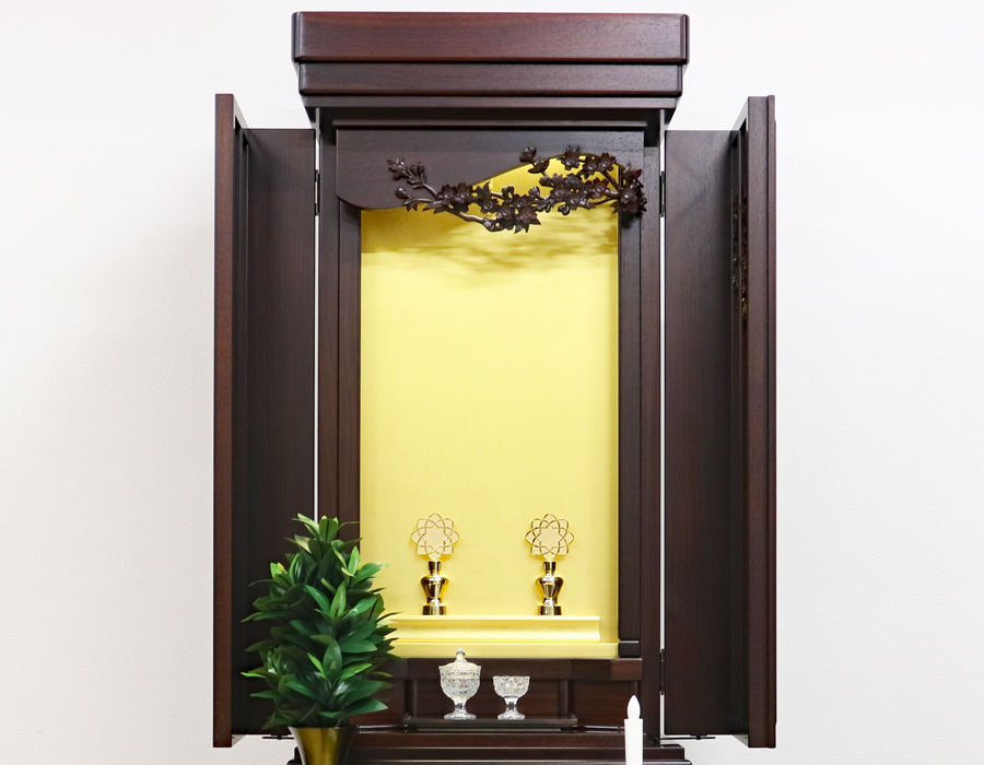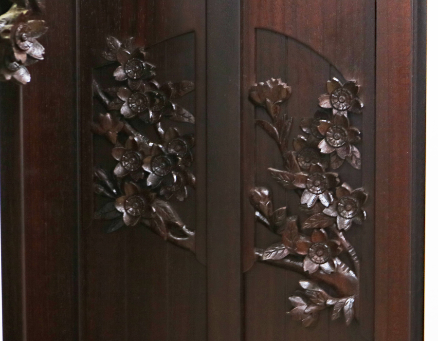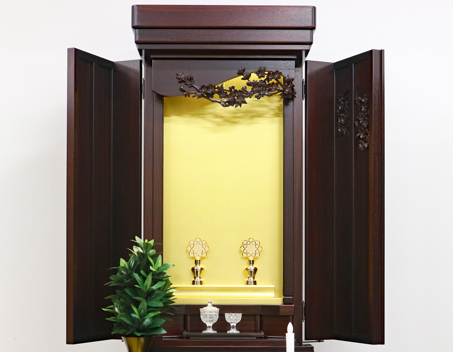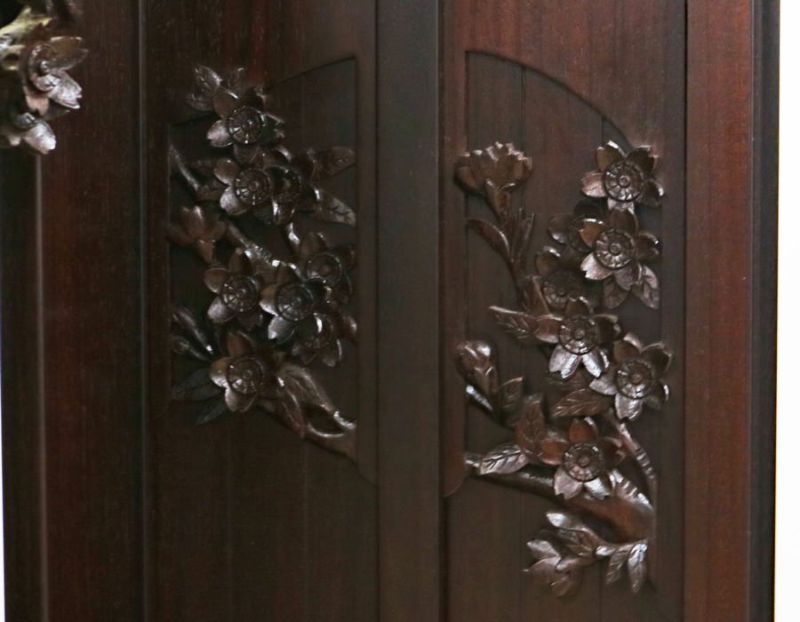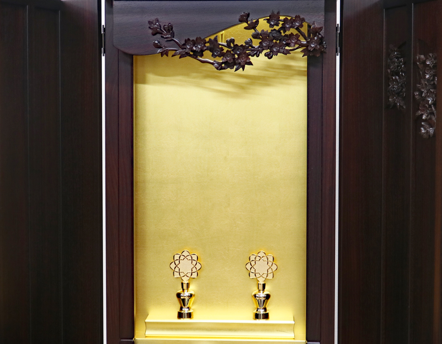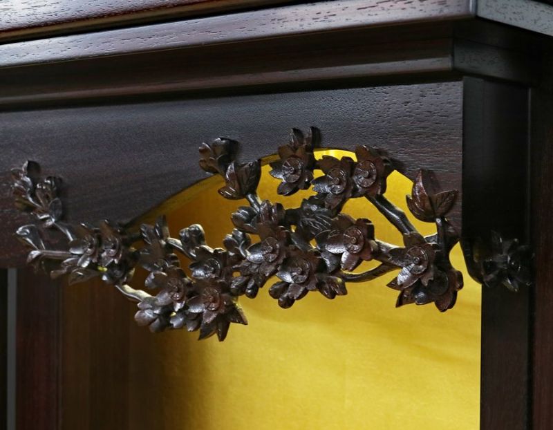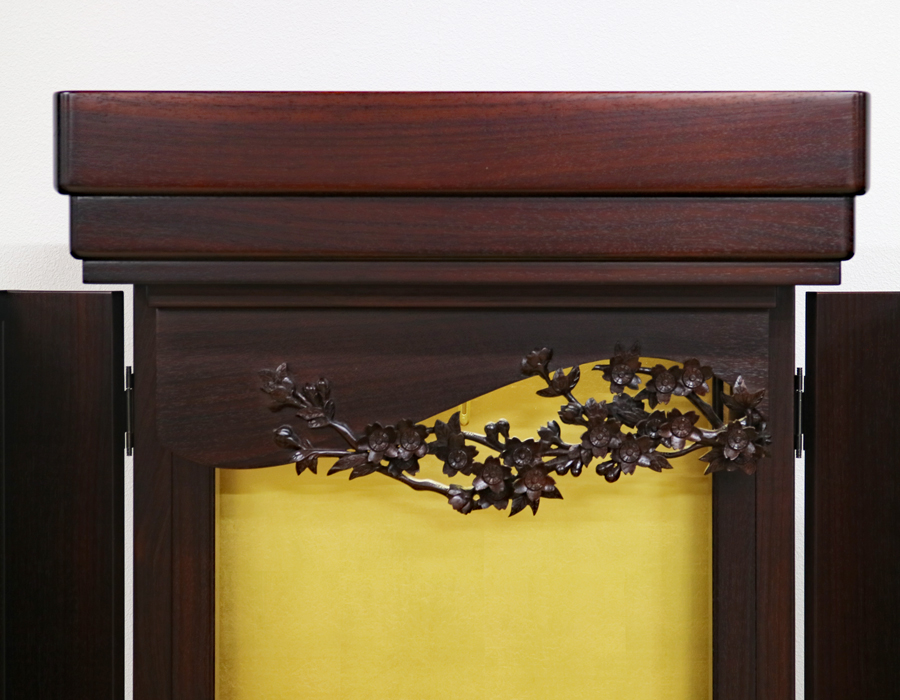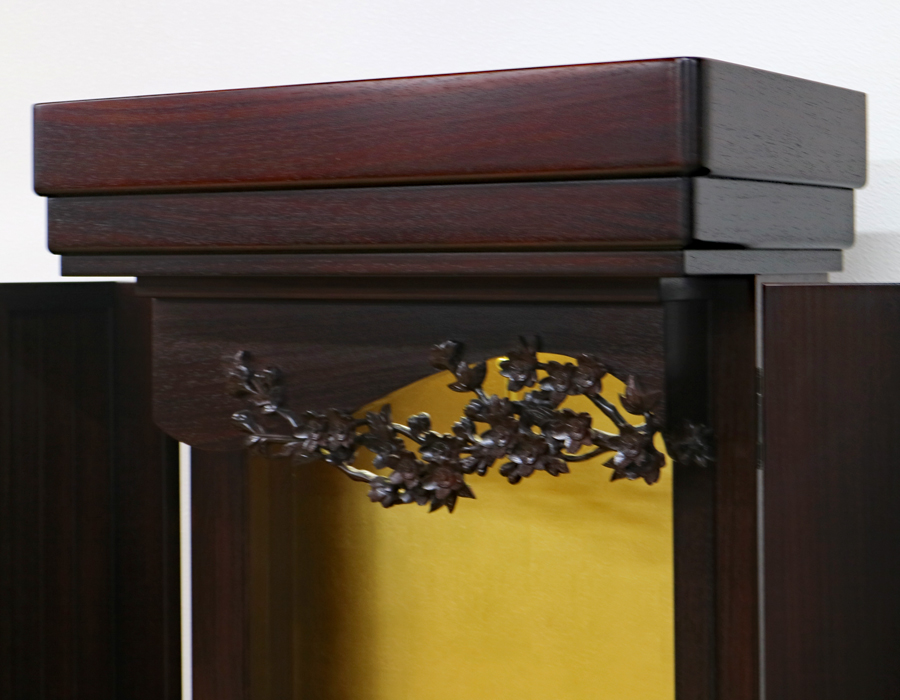 お仏壇正面右側の大戸にもソノクリン(紫檀)の無垢板をふんだんに使用して、桜模様の彫りを立体的に仕上げています。