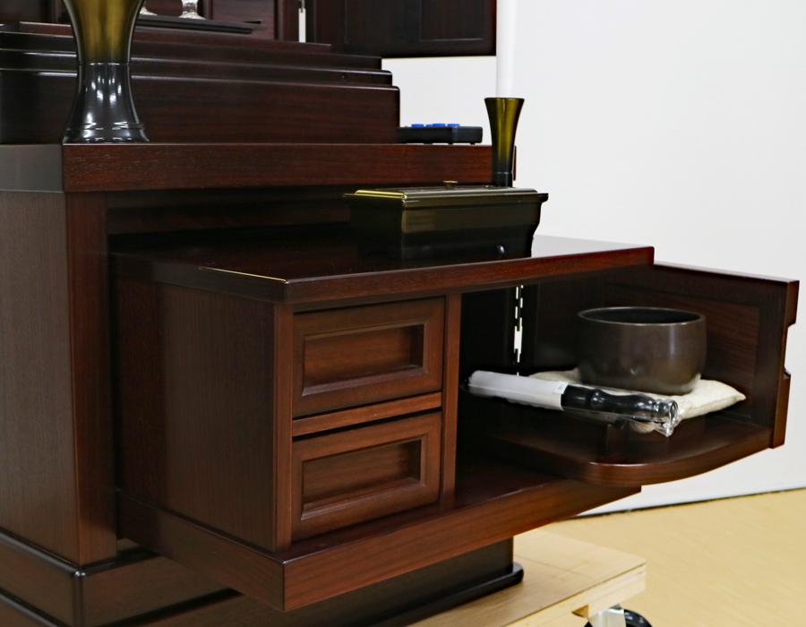 勤行・唱題のときはリンを手前に引き出しながら右側に回すように出して使います。 終了時にはリン台を元に戻して、中に押し込む感じで収納します。