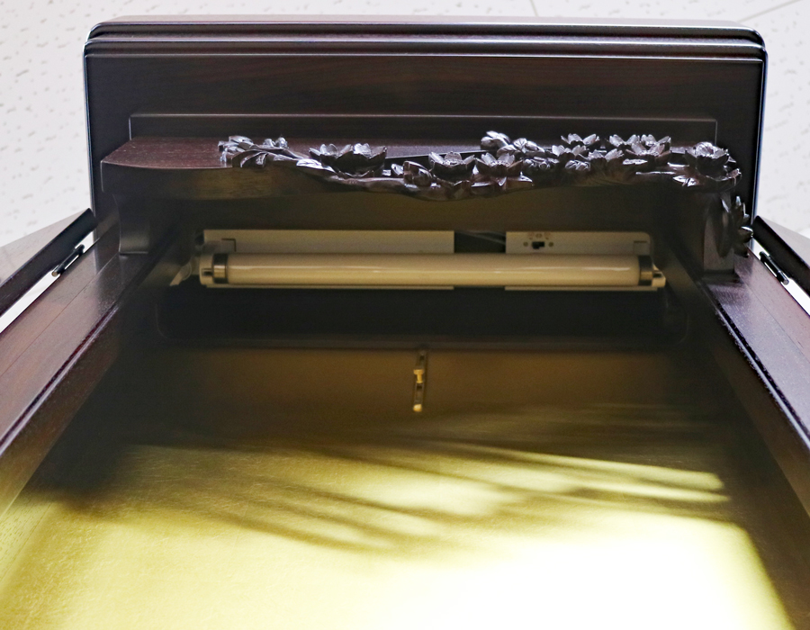 ソノクリン(紫檀またはローズウッド)の無垢板をふんだんに使用して、桜模様の彫りを施し優しい色味に仕上がっております。電動扉は設置場所に応じて扉の開き方が大開、中開きと2段階に調節することができます。