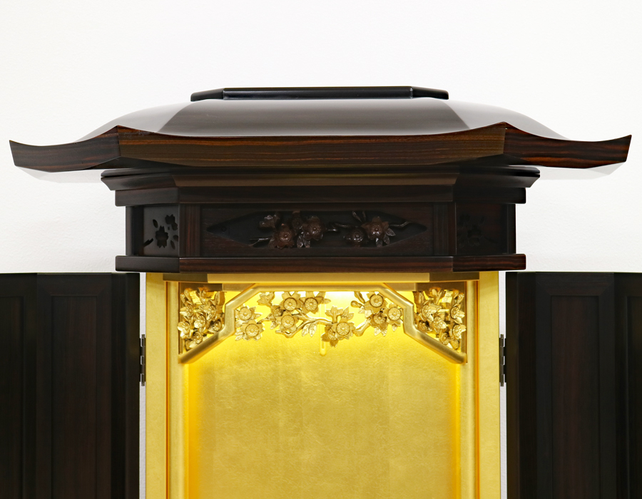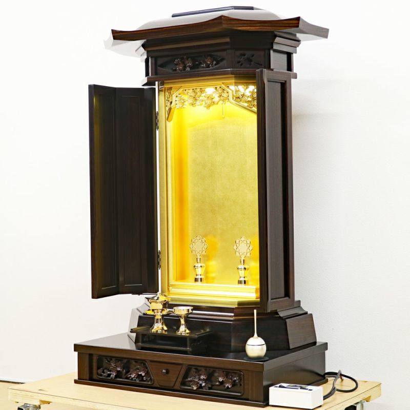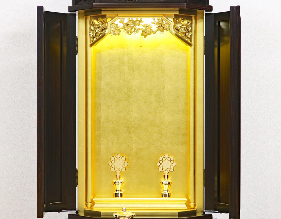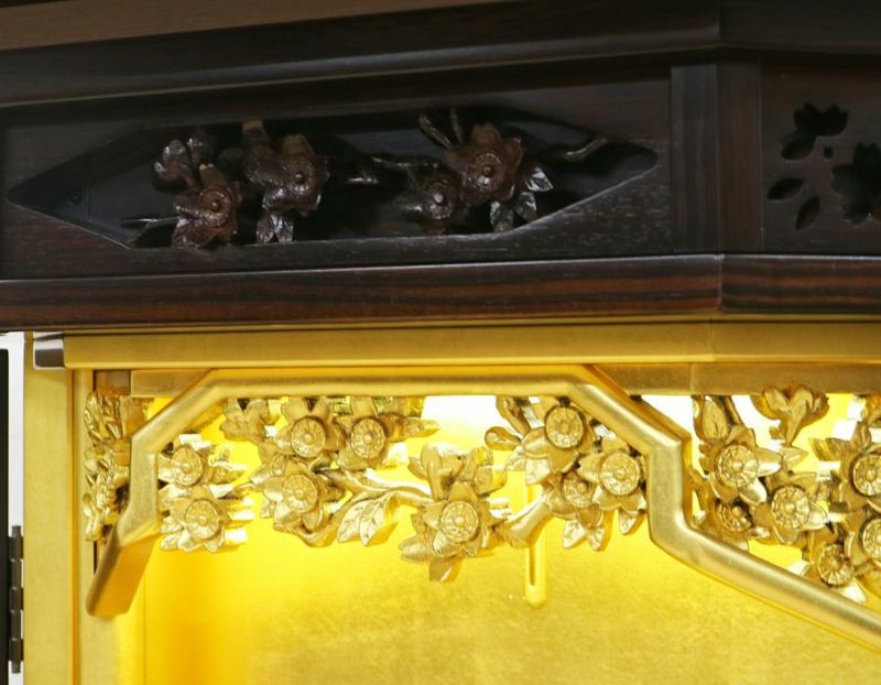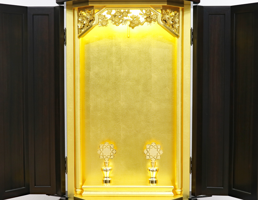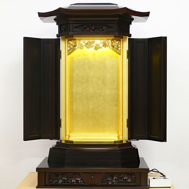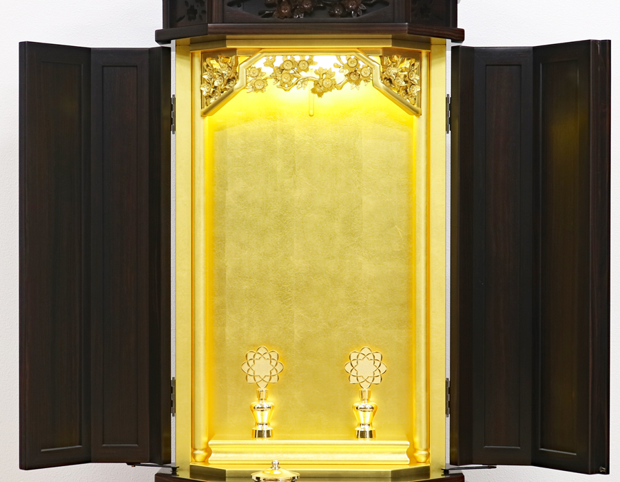 お厨子を開くと美しく本金箔を施した厨子板がご本尊様をさらに荘厳にしてくれます。 本金箔と金色塗装では輝きが違うのは一目瞭然です。 内部には蛍光灯照明も付属していますのでご本尊様を明るく照らしてくれます。