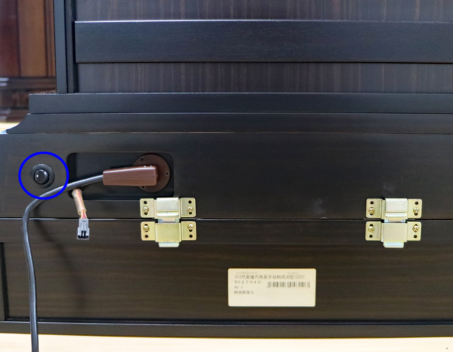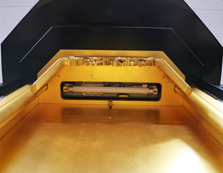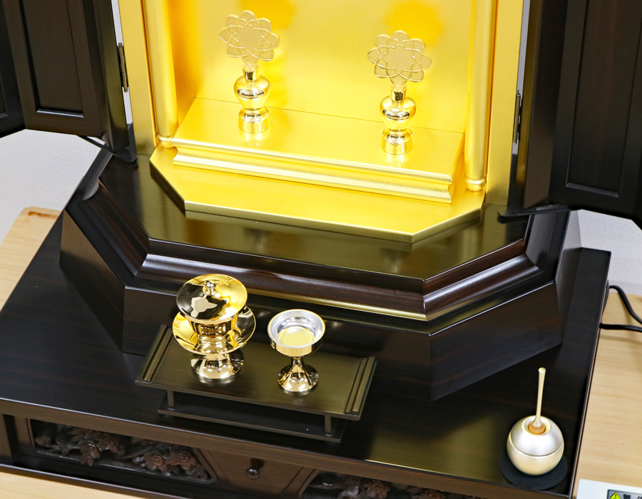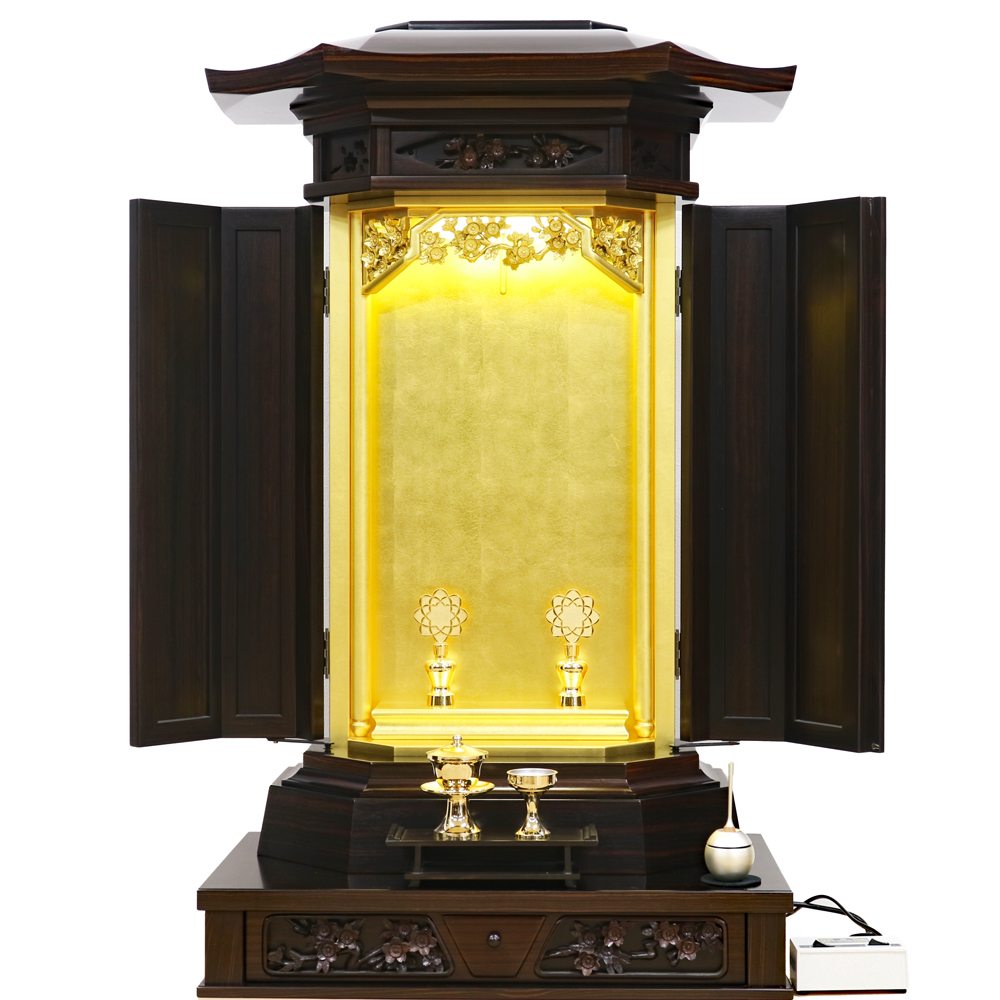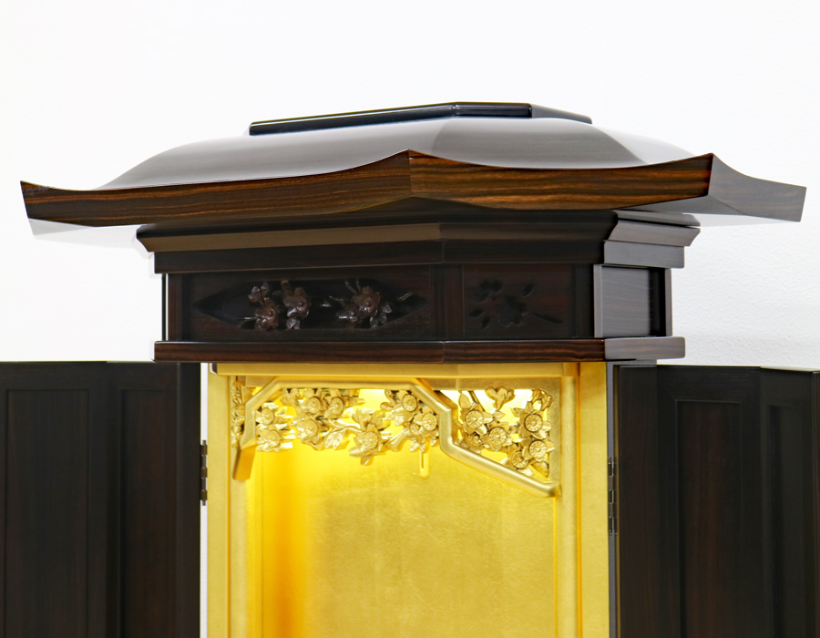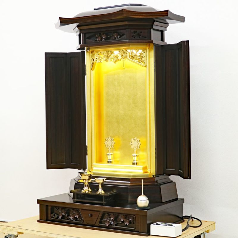 お厨子を開くと美しく本金箔を施した厨子板がご本尊様をさらに荘厳にしてくれます。 本金箔と金色塗装では輝きが違うのは一目瞭然です。 内部には蛍光灯照明も付属していますのでご本尊様を明るく照らしてくれます。
