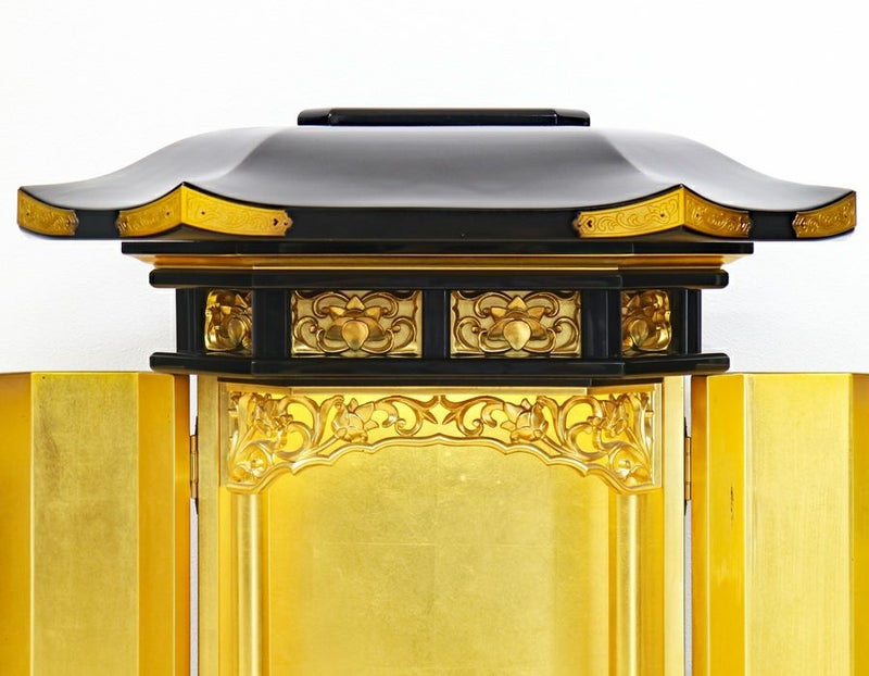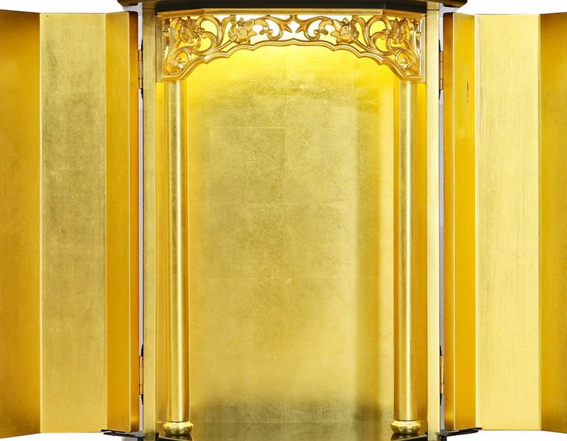 お厨子を開くと美しく本金箔を施した厨子板がご本尊様をさらに荘厳にしてくれます。 本金箔と金色塗装では輝きが違うのは一目瞭然です。 内部には蛍光灯6w照明も付属していますのでご本尊様を明るく照らしてくれます。