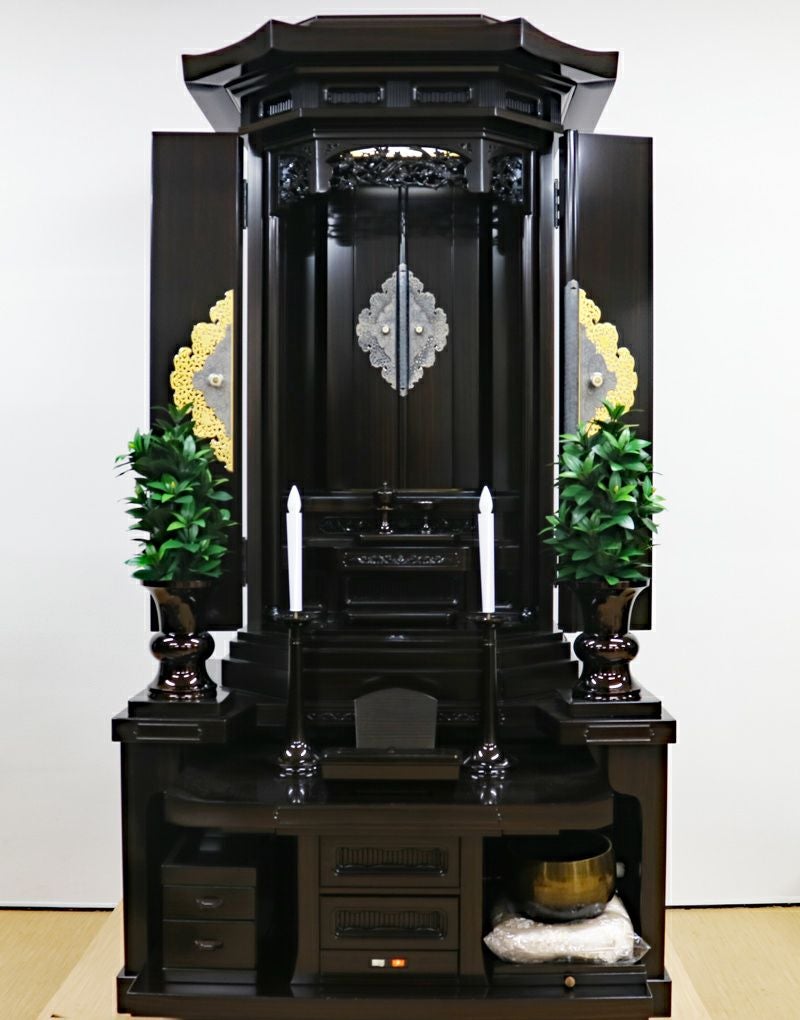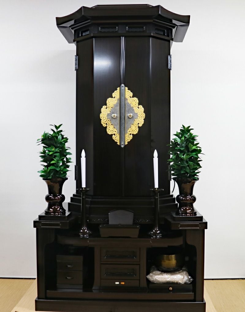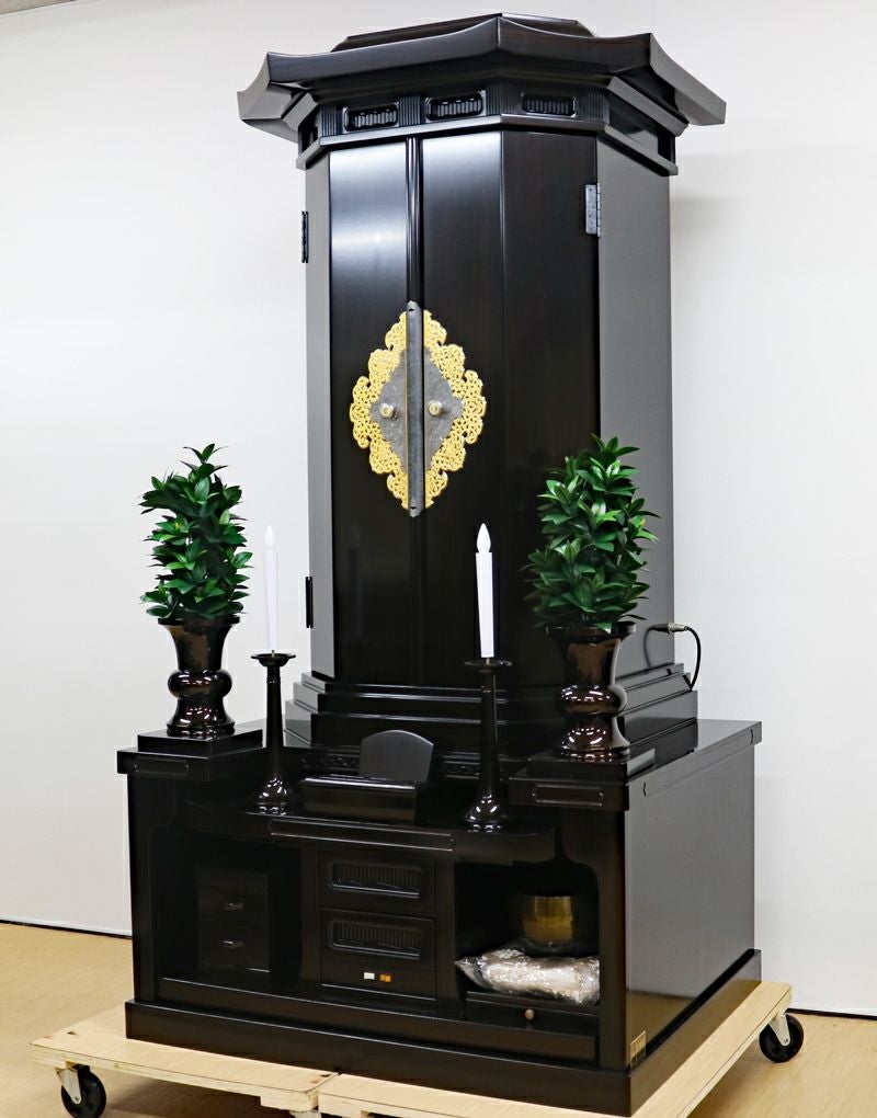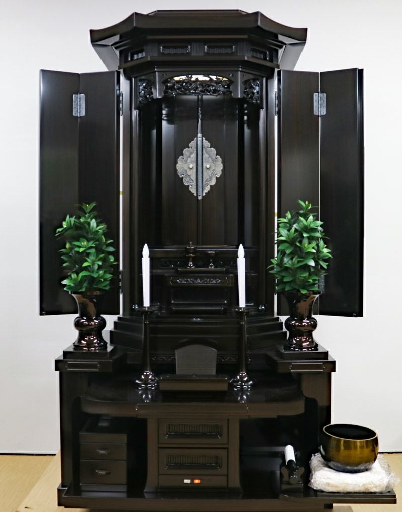 現在でも販売中の「大河 収納型 黒檀」中古仏壇です。 最高級の厨子収納型仏壇です。 黒檀材を使用した、デザインは圧巻の一言です。 精悍な面持ちで金具一つ一つ丁寧に仕上がっております。