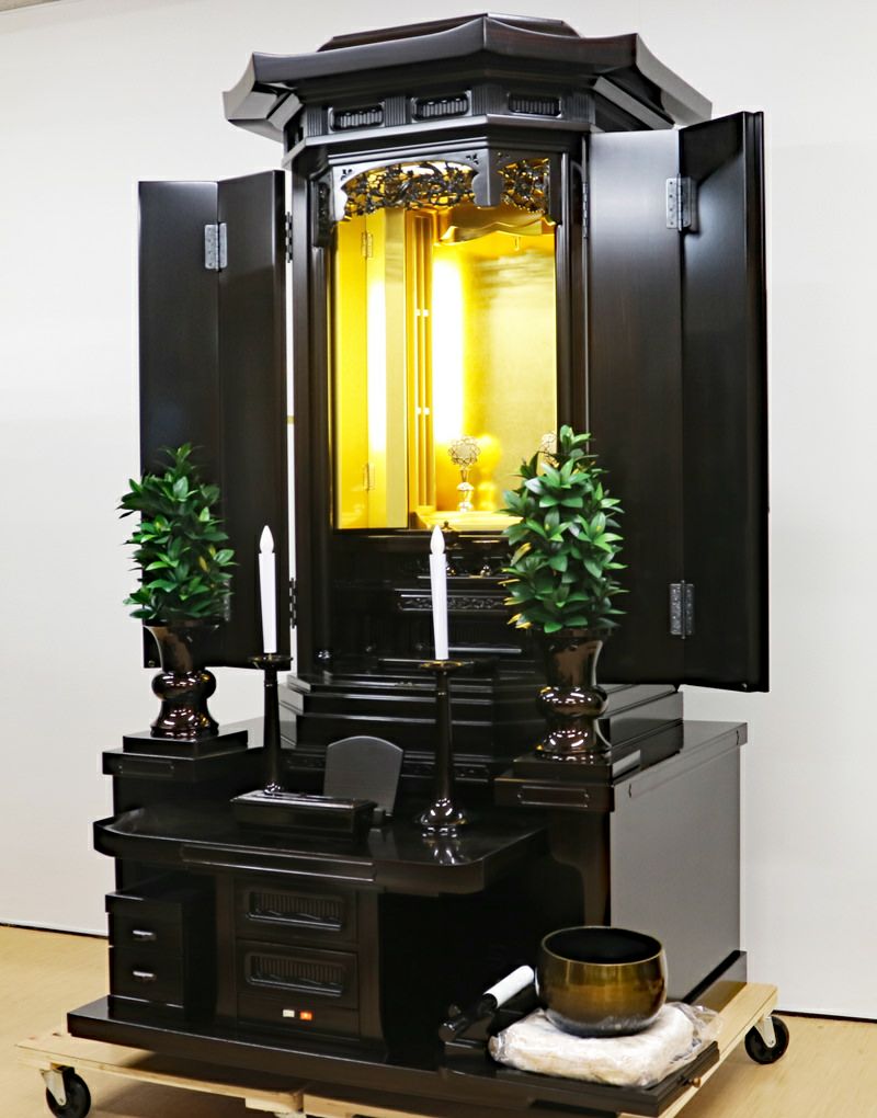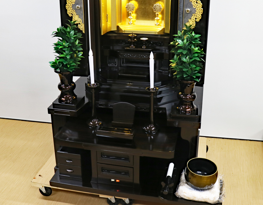 仏具付きを選択の場合は新品の高岡製会館型銅器仏具セットが付属いたします。