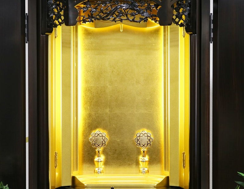 お厨子を開くと美しく本金箔を施した厨子板がご本尊様をさらに荘厳にしてくれます。 本金箔と金色塗装では輝きが違うのは一目瞭然です。 内部には蛍光灯照明も付属していますのでご本尊様を明るく照らしてくれます。