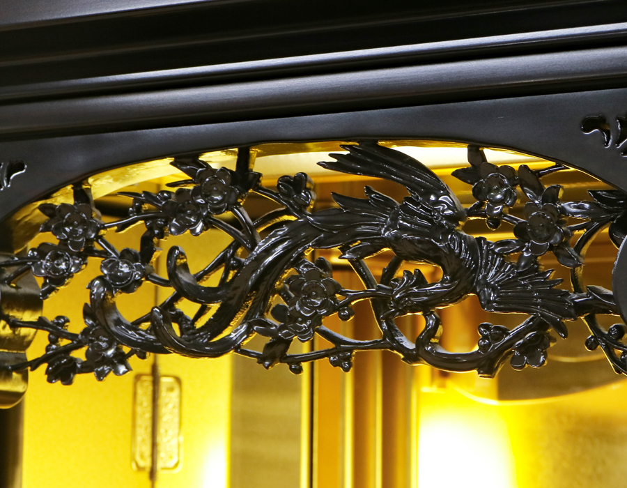 欄間部分の黒檀無垢を贅沢に使用した桜と鳳凰の彫刻