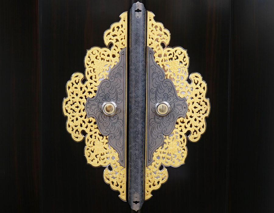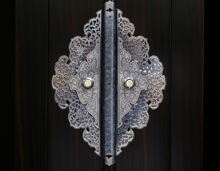 厨子扉は、高級いぶし銀を使用しております。こちらの金具は、二重になっております。金具の取っ手までこだわって作成されております。