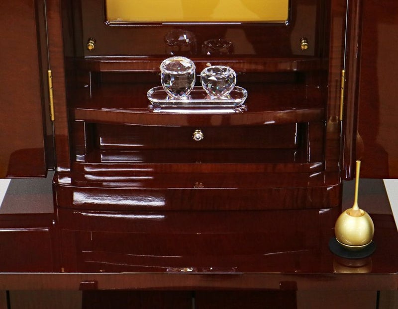 仏具付きを選択の場合、上記お写真のクリスタル製の仏器・茶器・天目とチェリンが付属いたします。