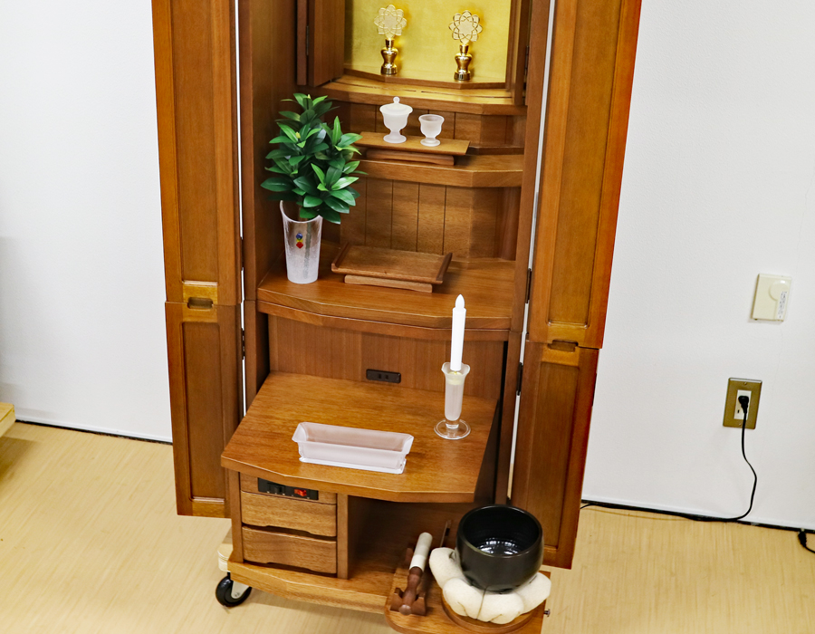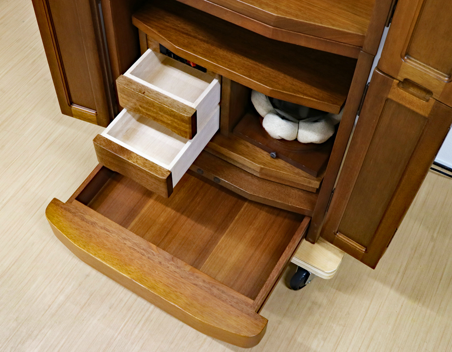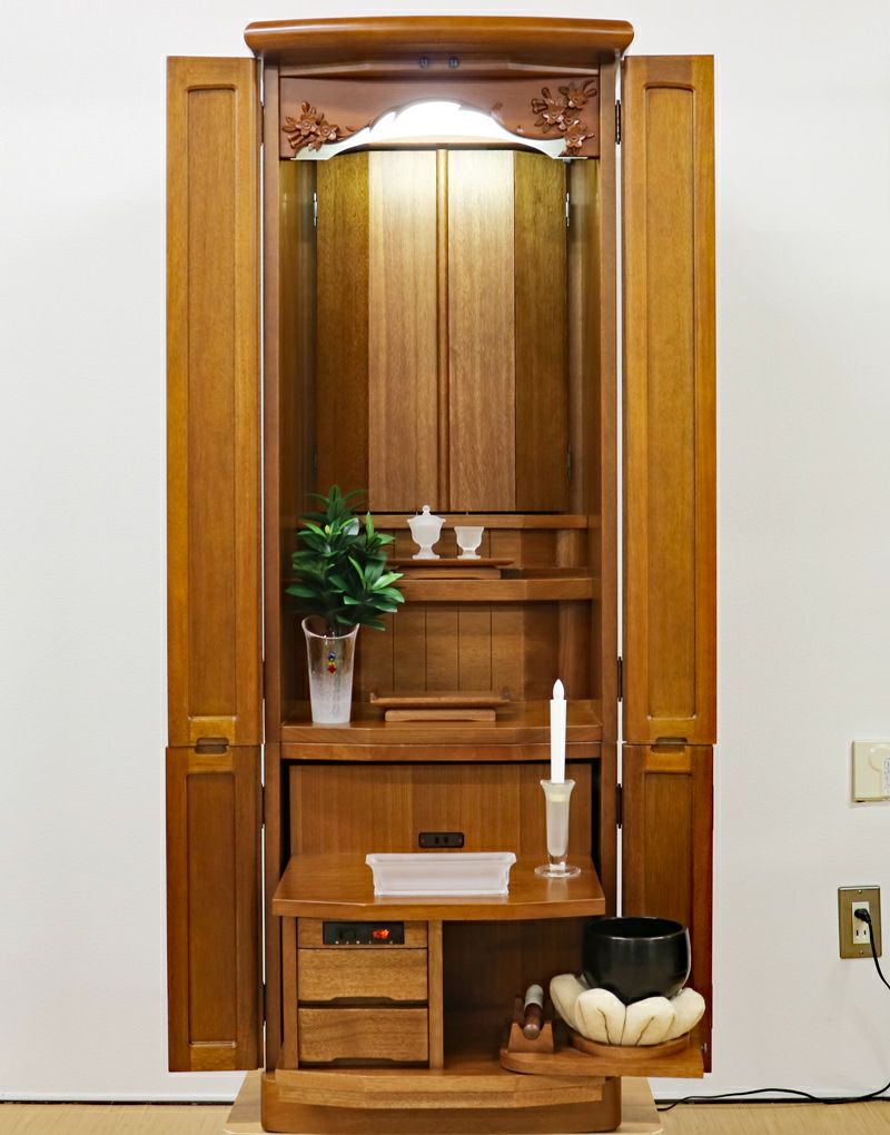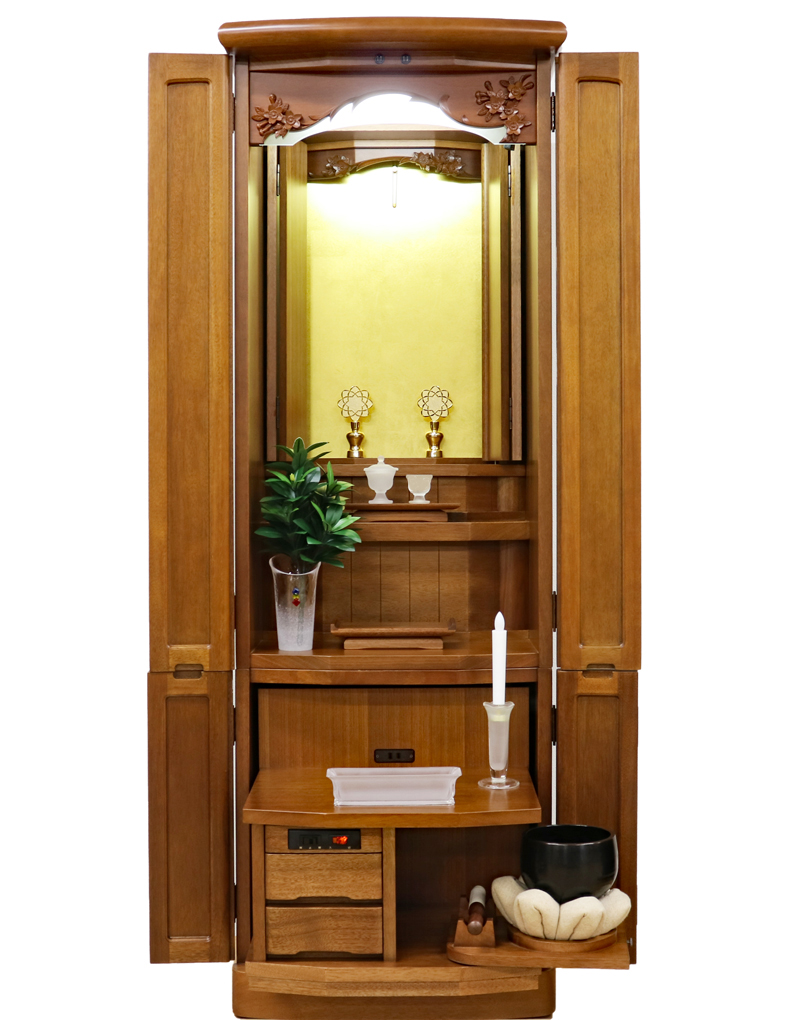 落ち着いた木のやさしさを感じるお仏壇です。無垢板を使用しているので、年数とともに色合いが変わり味が出てきます。