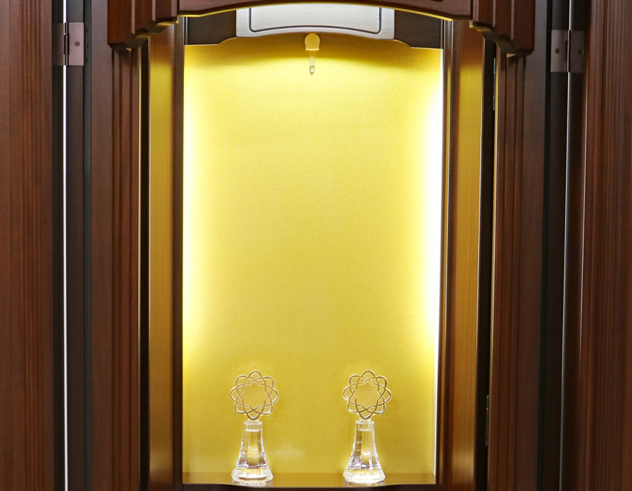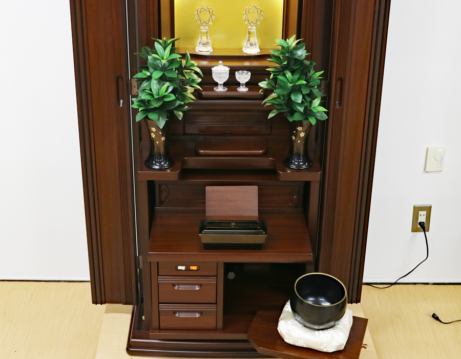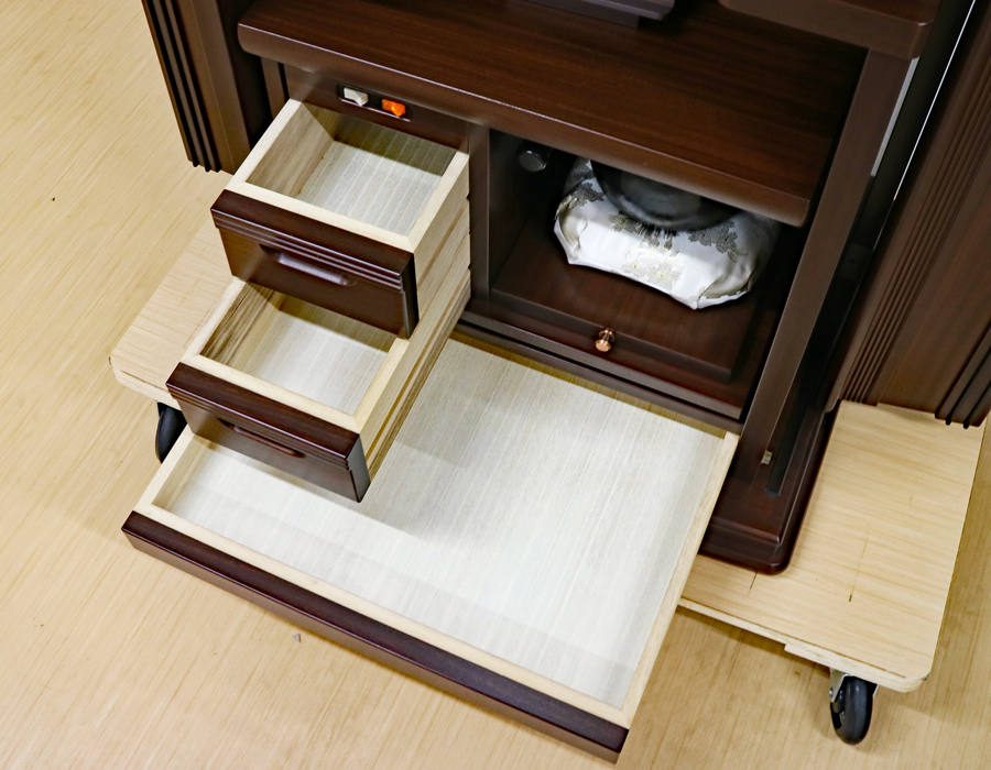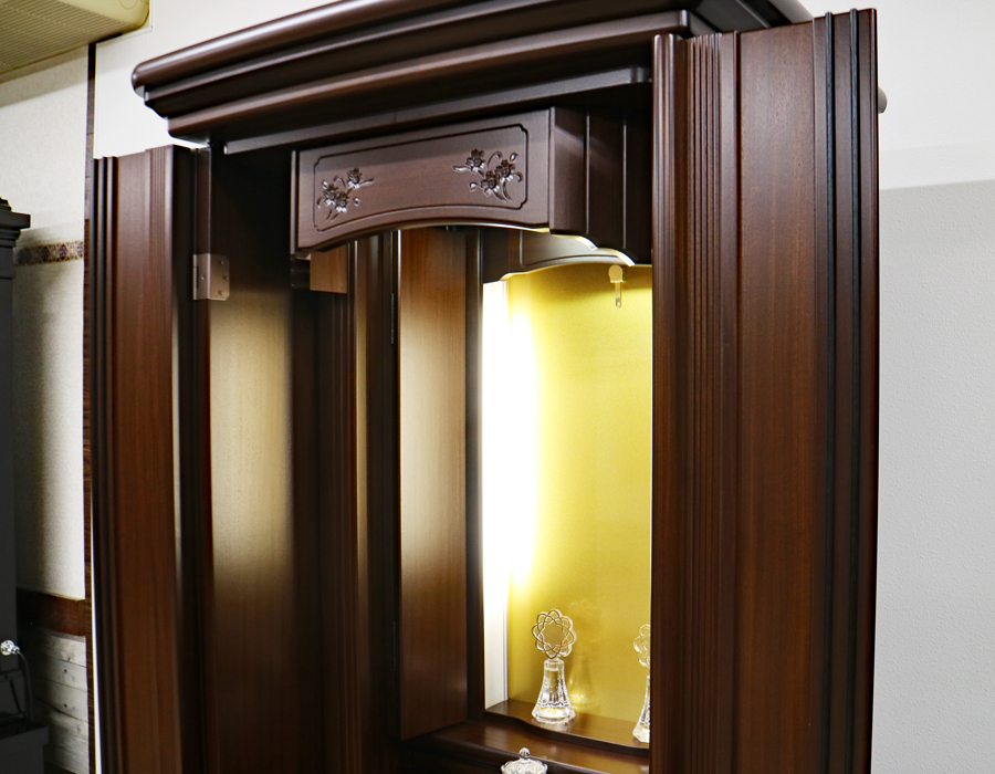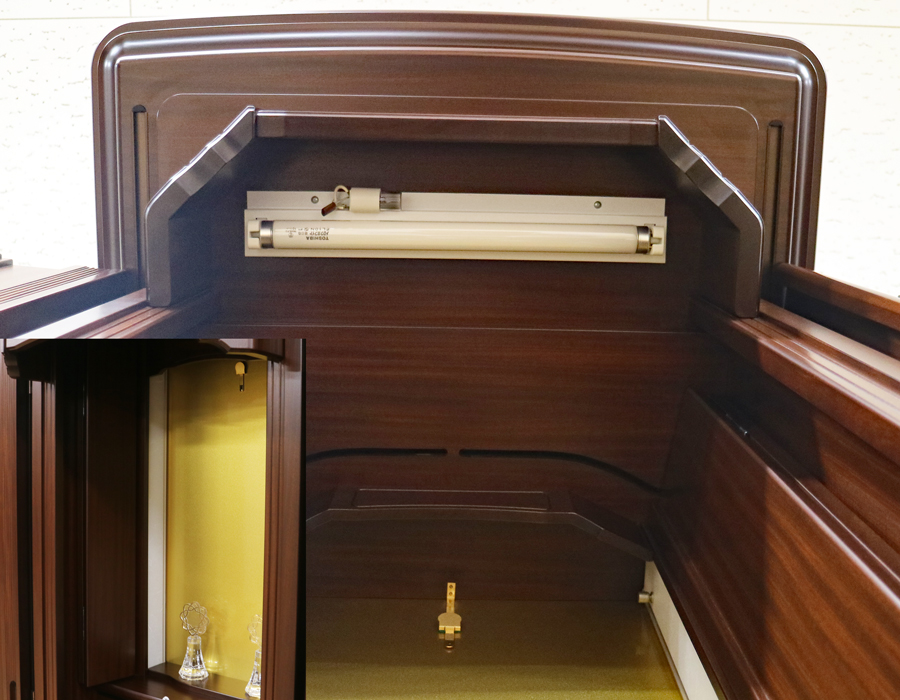 仏壇内上部に1か所、厨子内両脇に2箇所蛍光灯が設置されている、彩光厨子が採用されております。