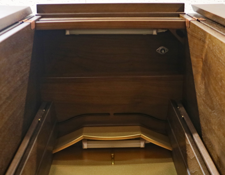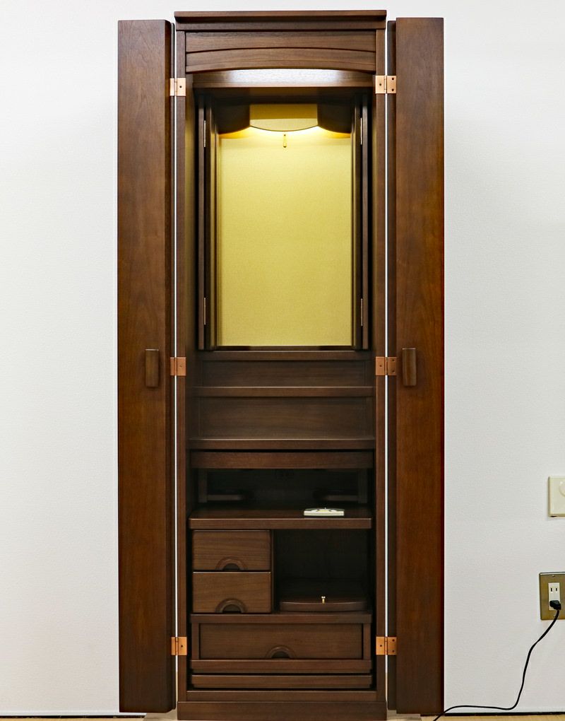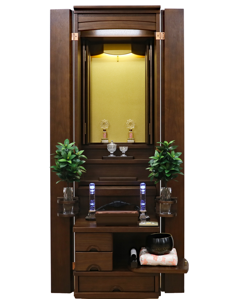 ポプラ材の無垢・ウォールナット材の薄板を使用した、暖かみのあるお色味のお仏壇となります。