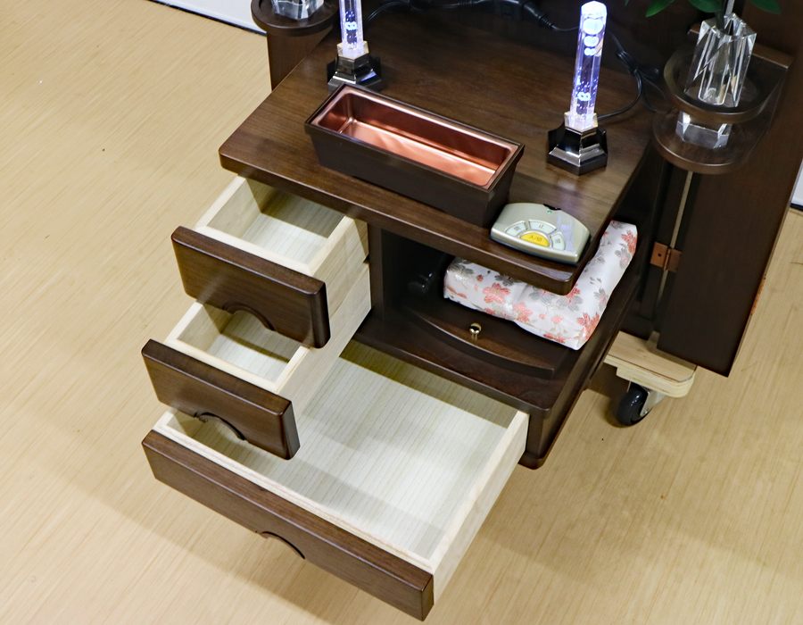 収納経机に引き出しが3か所ございます。