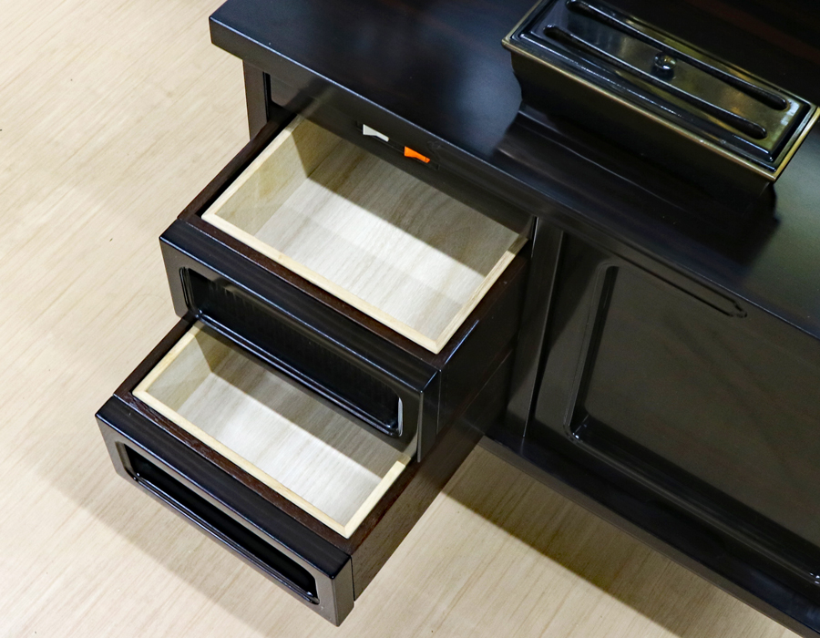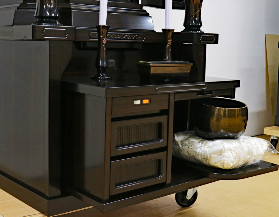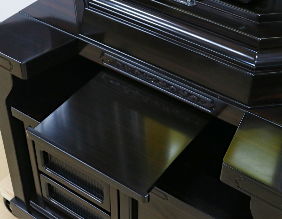 花台をスライドしますと、仏壇全体が広くなりよりご本尊様を荘厳することができます。 拠点・地区での会合にぴったりです。