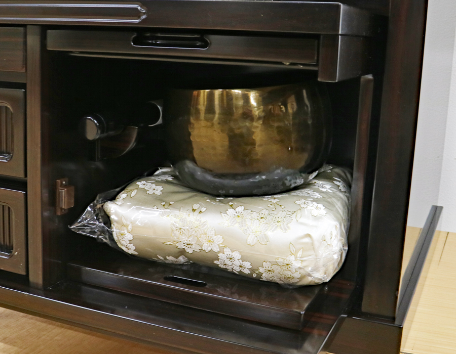 下台には収納リン台がございます。 付属のリンは6寸(直径18.5cm)のリンセットが付属いたします。