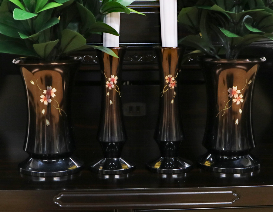 仏具付き選択の場合、桜の彫金の入ったおしゃれな銅器仏具セットが付属いたします。