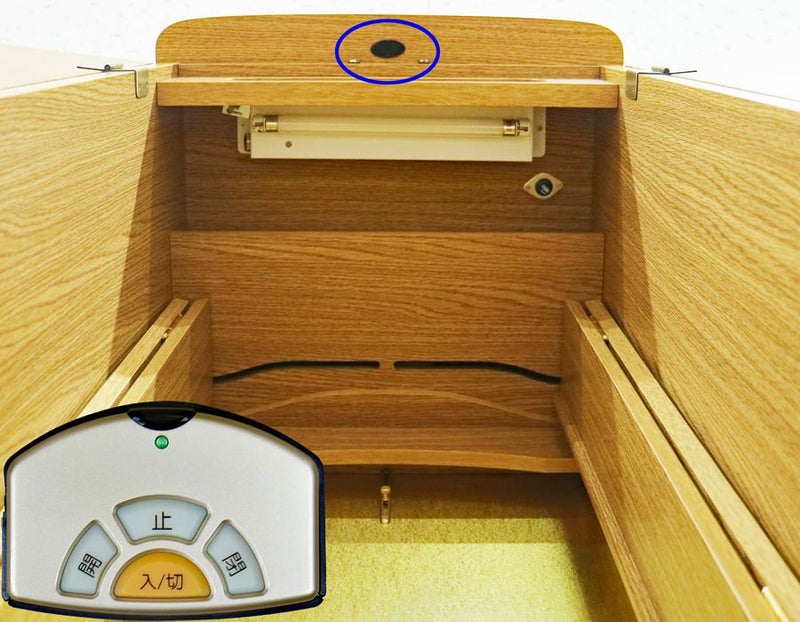 上記お写真の青丸の箇所がリモコン受信機になりますので、こちらに向けてリモコンを使用してください。