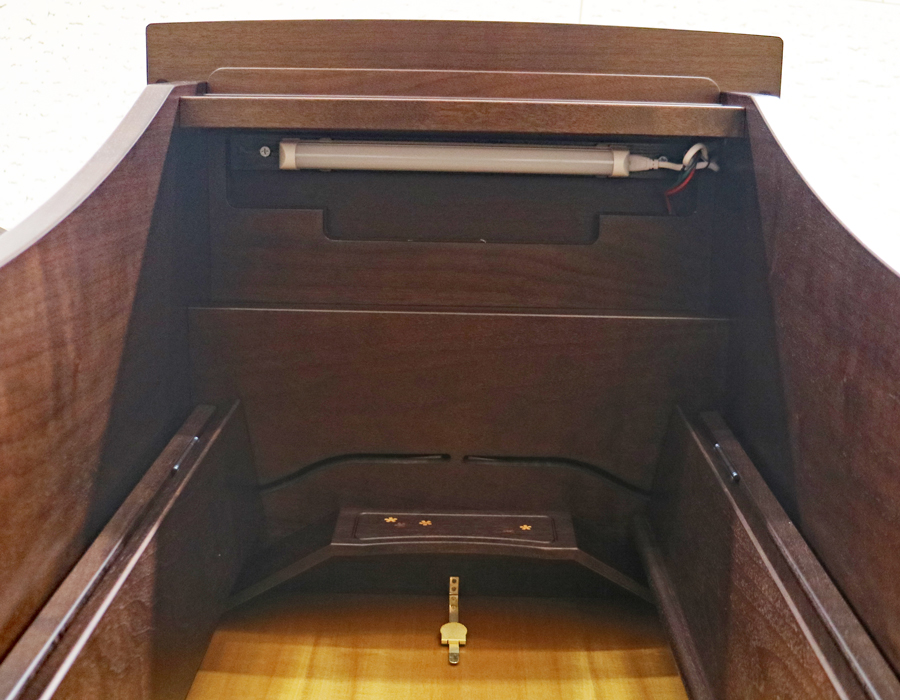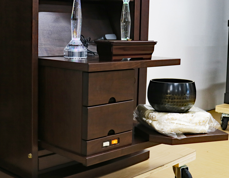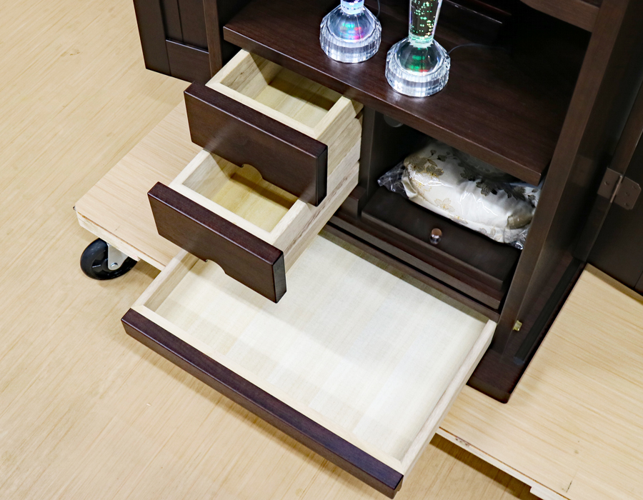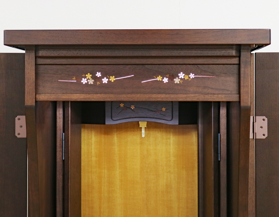 厨子下も欄間同様に、桜の象眼はLED照明を点灯すると光る演出されておりシックな中にも華やかさのあるデザインに仕上がっております。
