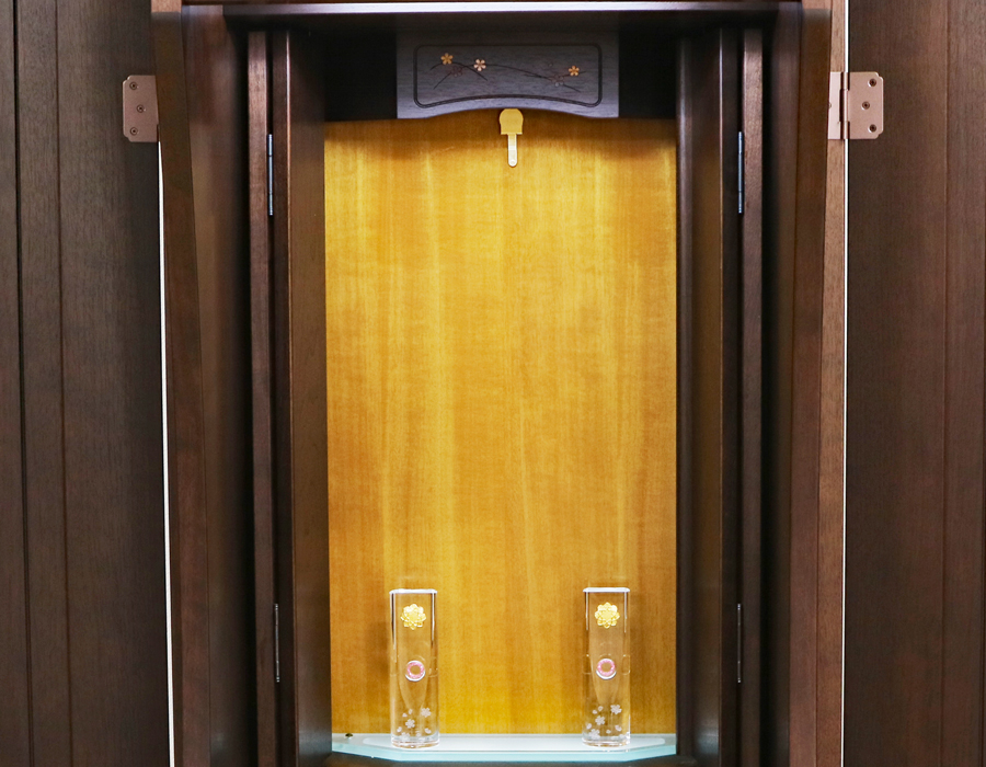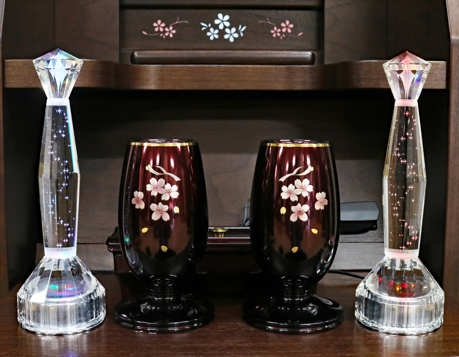 仏具付きに場合、付属の花立は銅生産で有名な高岡製の桜彫金入りワイン花立が付属いたします。