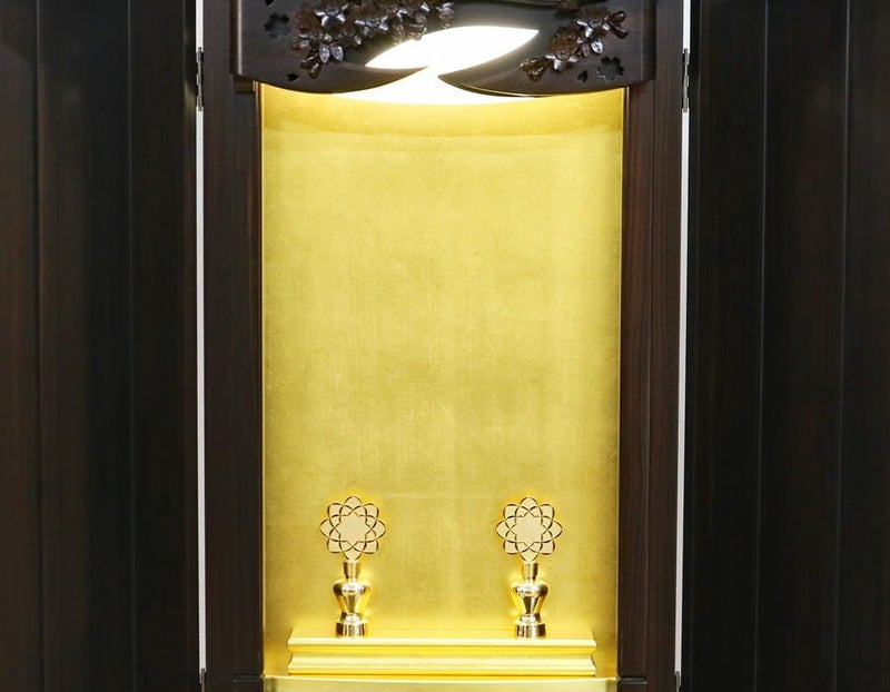 本金箔と金色塗装では輝きが違うのは一目瞭然です。 内部にはLED照明も付属していますのでご本尊様を明るく照らしてくれます。